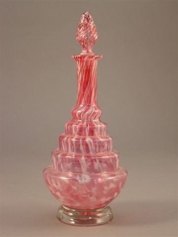CARAFE ovoïde en verre soufflé moulé rose nuagé de légères vitrifications intercalaires blanches. Corps à gradins successifs. Col resserré. Piédouche à doucine.