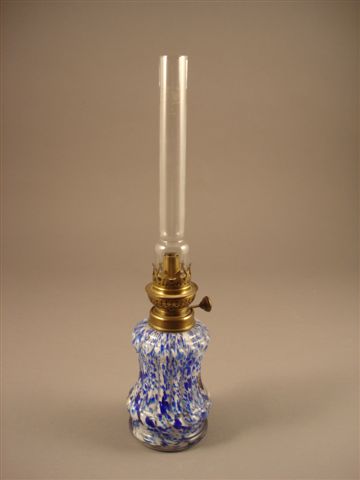 LAMPE À PÉTROLE en verre soufflé moulé transparent coloré de vitrifications intercalaires bleu et blanc et pailleté d'or.
