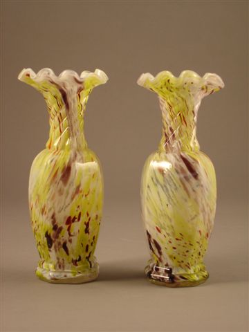 Paire de VASES balustre à pans coupés en verre soufflé moulé, marbré de vitrifications intercalaires jaune, brun et blanc laiteux. Col torsadé se terminant en une petite corolle florale polylobée. Base octogonale.
