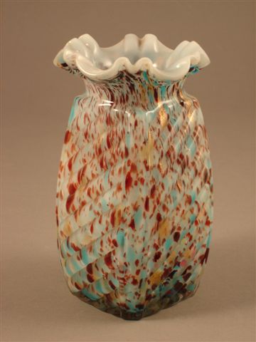 VASE de section carrée à pans coupés en verre soufflé moulé, coloré de vitrifications intercalaires brun, bleu et blanc laiteux et pailleté d'or. Col hexagonal mouvementé. Panse décorée de larges godrons obliques.