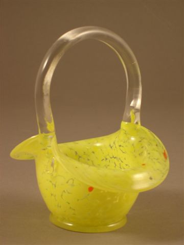 PANIER en verre soufflé moulé transparent coloré de vitrifications intercalaires jaune. Anse arrondie en application. Large bordure. Base à doucine.
