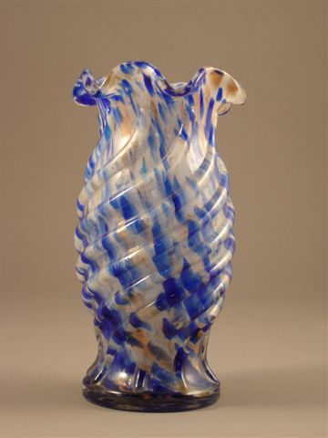 VASE balustre en verre soufflé moulé, coloré de poudres vitrifiées bleu et pailleté d'or. Large col hexagonal ondulant. Panse renflée décorée de côtes spiralées.