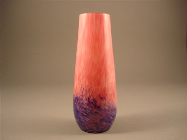 VASE rouleau en verre soufflé moulé rose et bleu nuagé de légères vitrifications intercalaires dans la masse. Col haut et panse renflée.