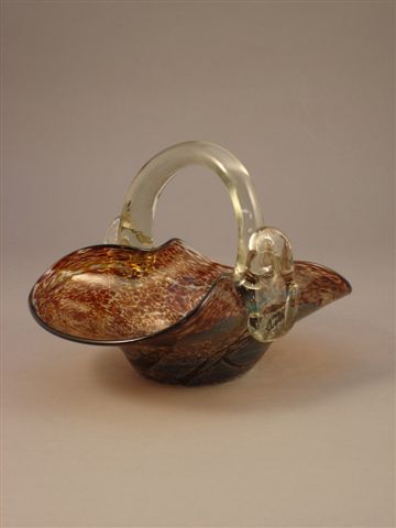 BIOT. COUPE en forme de panier en verre double-couche nuagé de vitrifications intercalaires de couleur brune. Anse en application. Col ondulant.