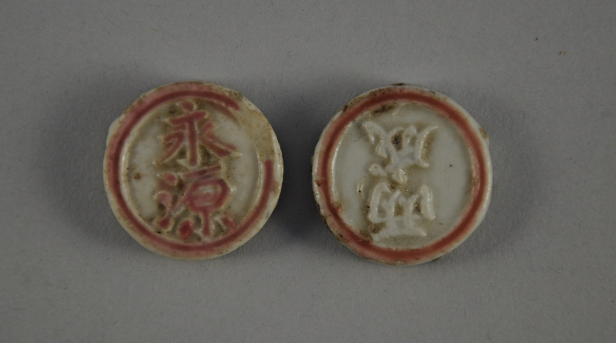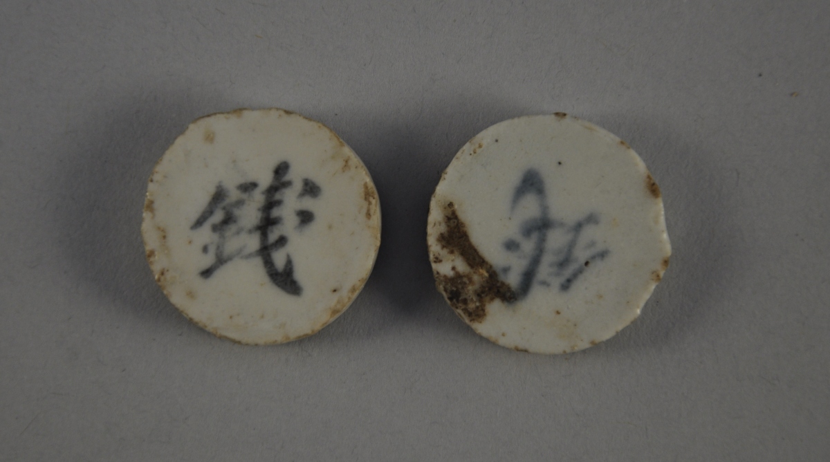 DEUX MONNAIES en porcelaine. Les faces à décor en relief d'un idéogramme et les revers marqués "Qian"