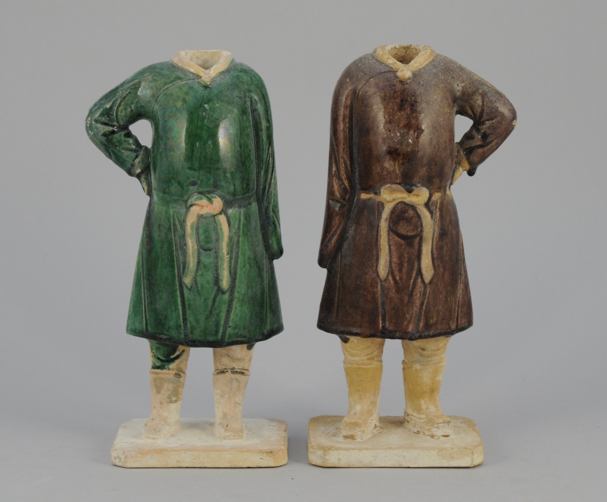 Deux STATUETTES en terre cuite partiellement émaillée, brun pour l'une, vert pour l'autre