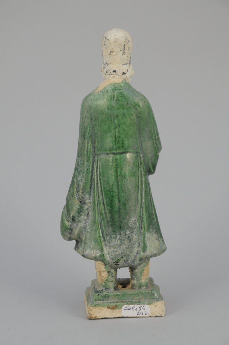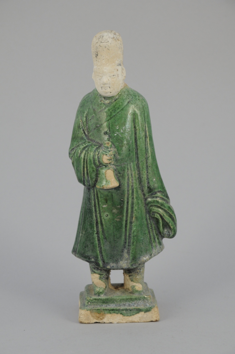 STATUETTE en terre cuite partiellement émaillée vert représentant un homme tenant une cloche.