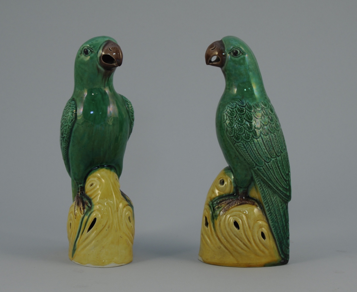 PAIRE de PERROQUETS en porcelaine émaillée jaune, vert et brun.