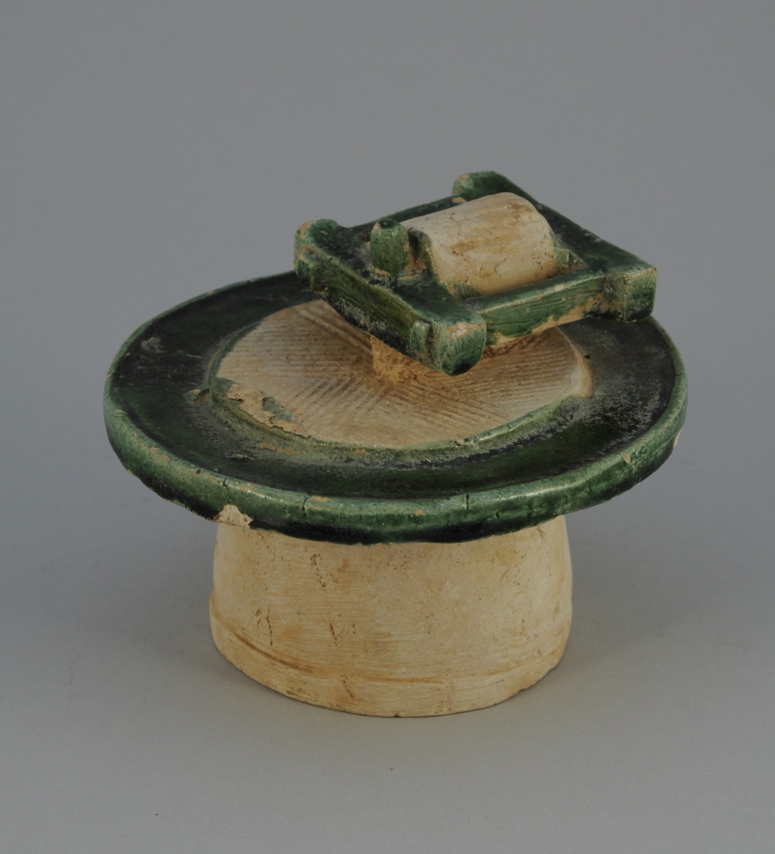 SUJET représentant une MEULE sur plan circulaire en terre cuite partiellement glaçurée vert.