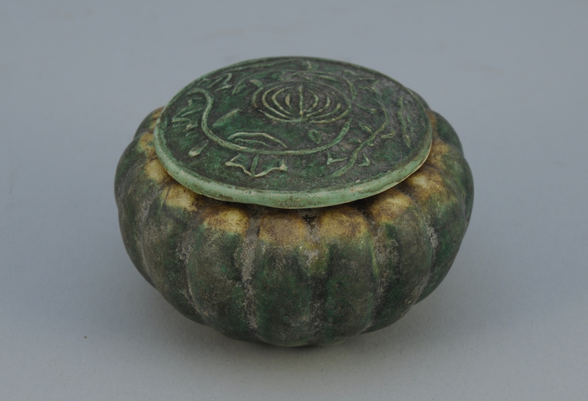 Petit POT couvert à côtes en terre blanche cuite glacurée vert. Couvercle à décor stylisé en relief.