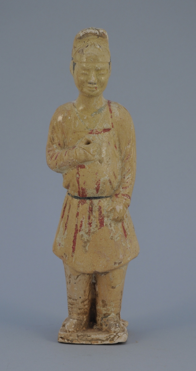 STATUETTE de gardien debout en terre cuite recouverte d'un fin émail beige. Restes de polychromie