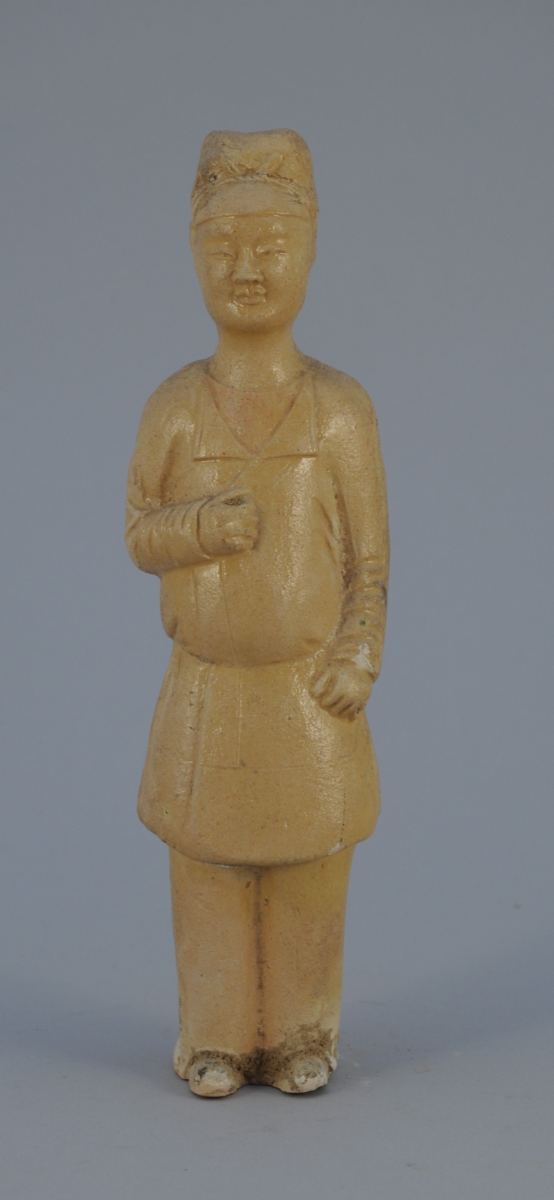 STATUETTE de personnage debout en terre cuite recouverte d'un fin émail beige.