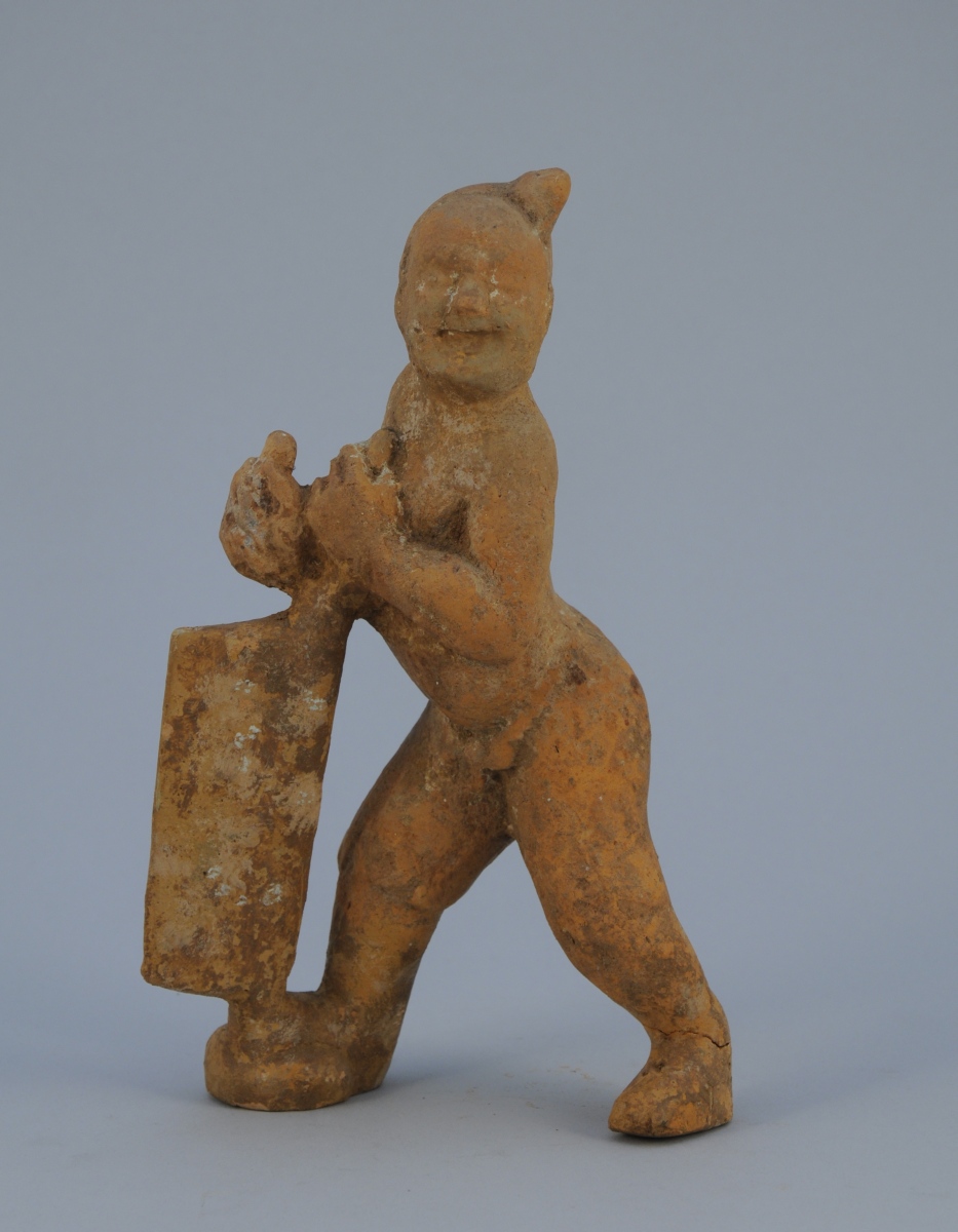 STATUETTE de personnage debout en terre cuite tenant un instrument.