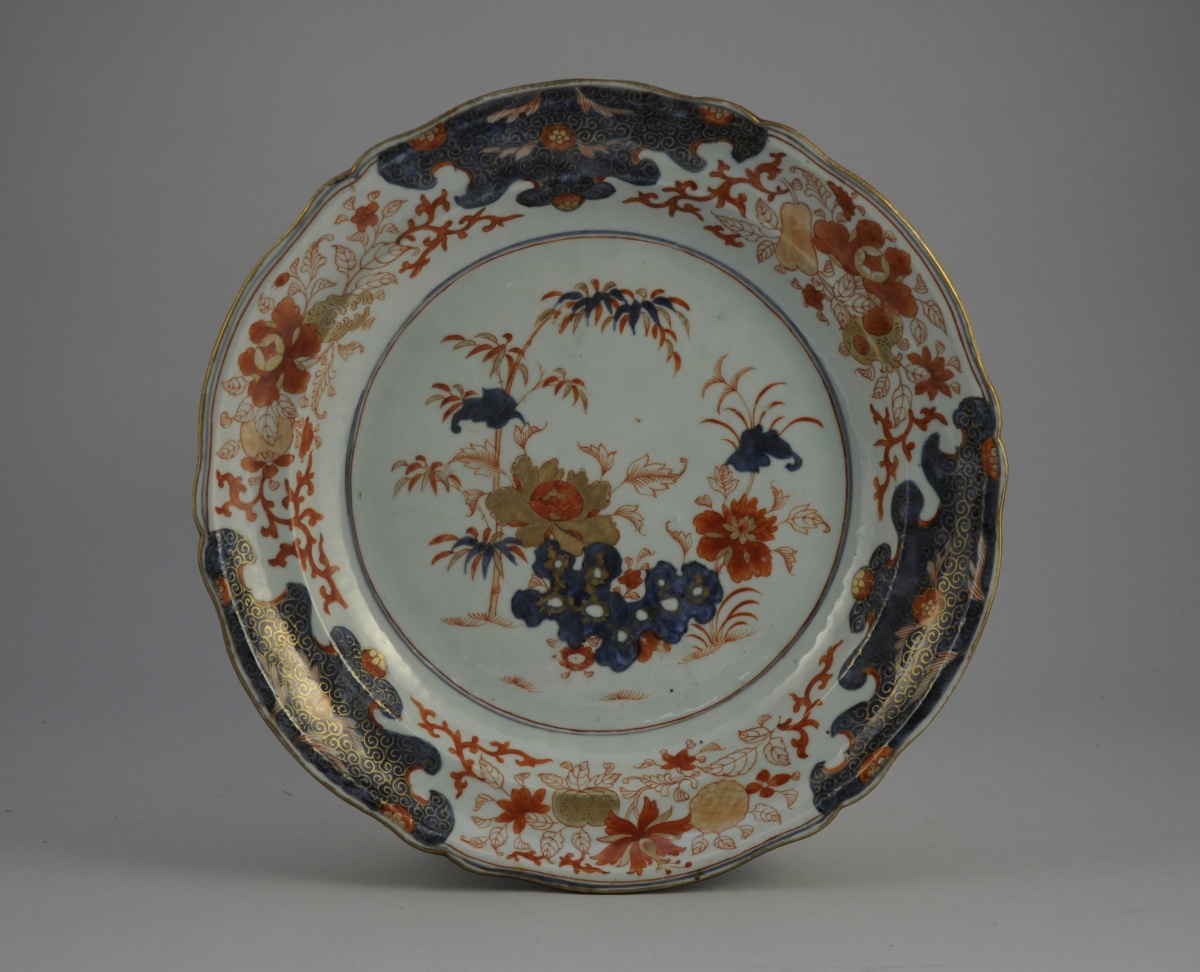 PLAT de forme lobée en porcelaine blanche décorée en bleu sous couverte, rouge de fer et émail or d'un rocher fleuri de pivoines et bambou. Bordure décorée de médaillons de fruits dans leur feuillage.