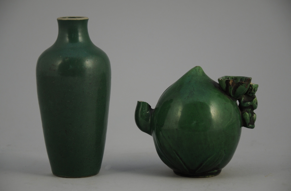 VERSEUSE en forme de pêche en porcelaine émaillée vert, et petit VASE balustre en porcelaine émaillée vert.