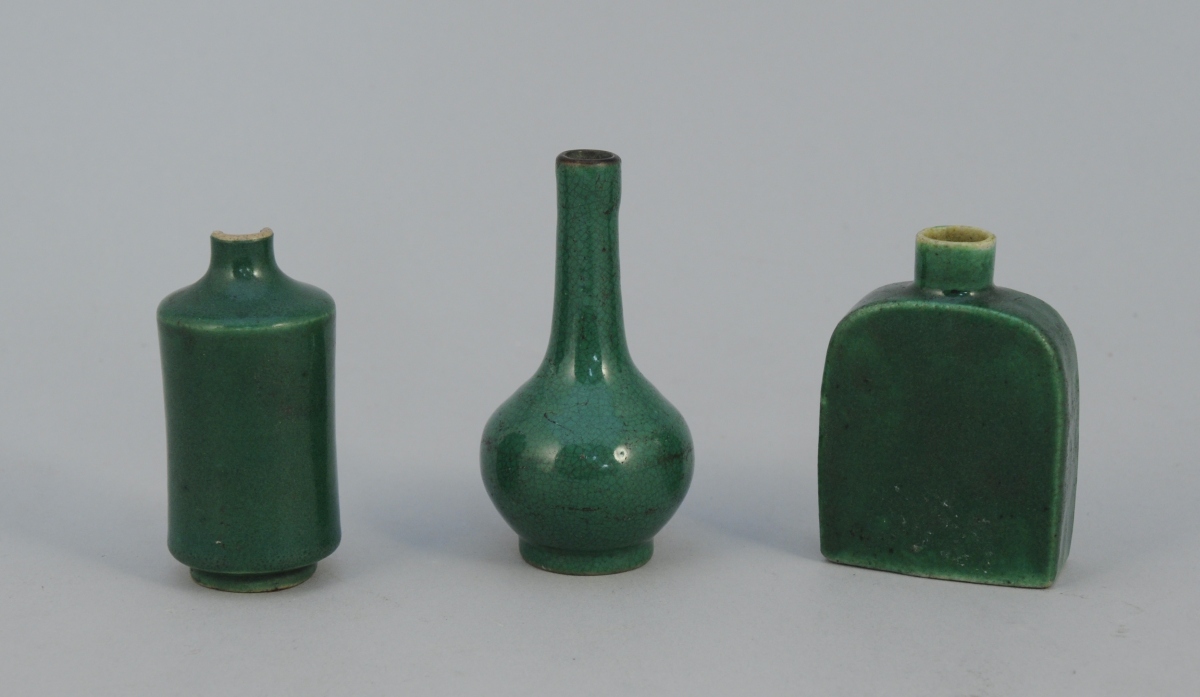 Trois petits FLACONS, cylindrique, quadrangulaire et de forme bouteille en porcelaine émaillée vert. Chine, XVIIIème (accident au col de l'un).