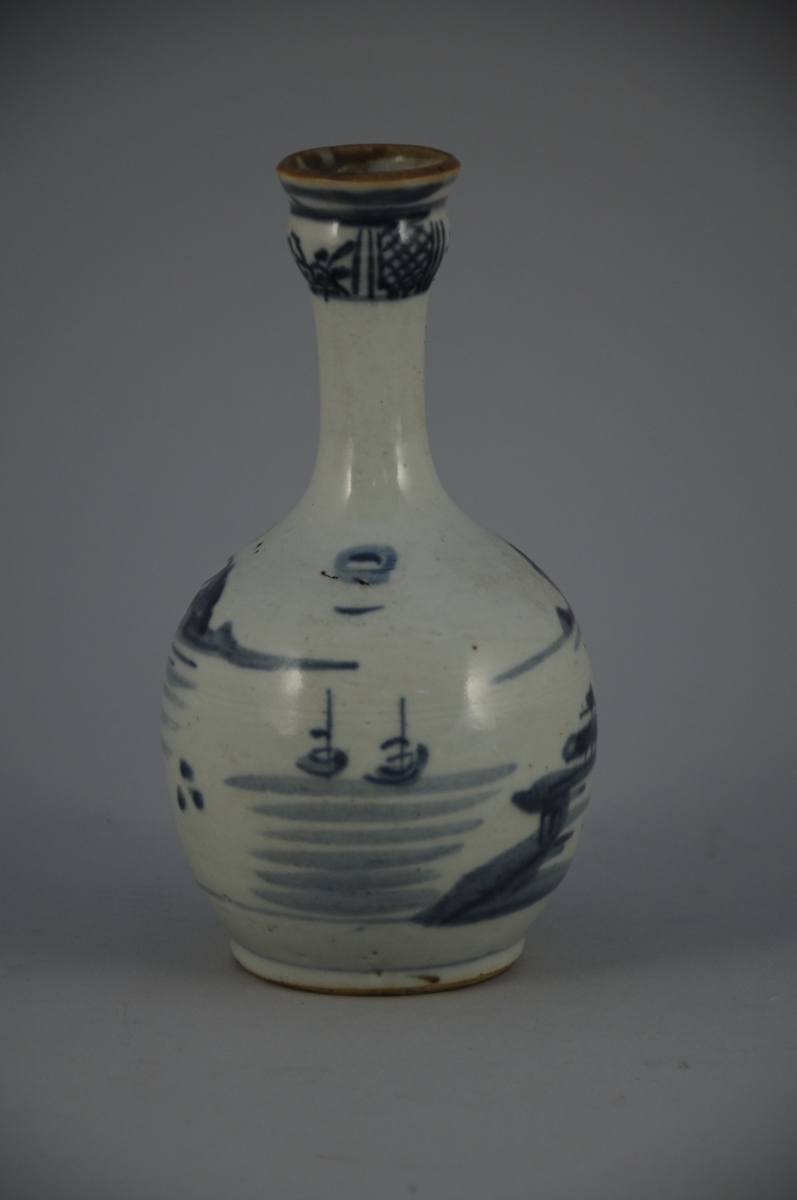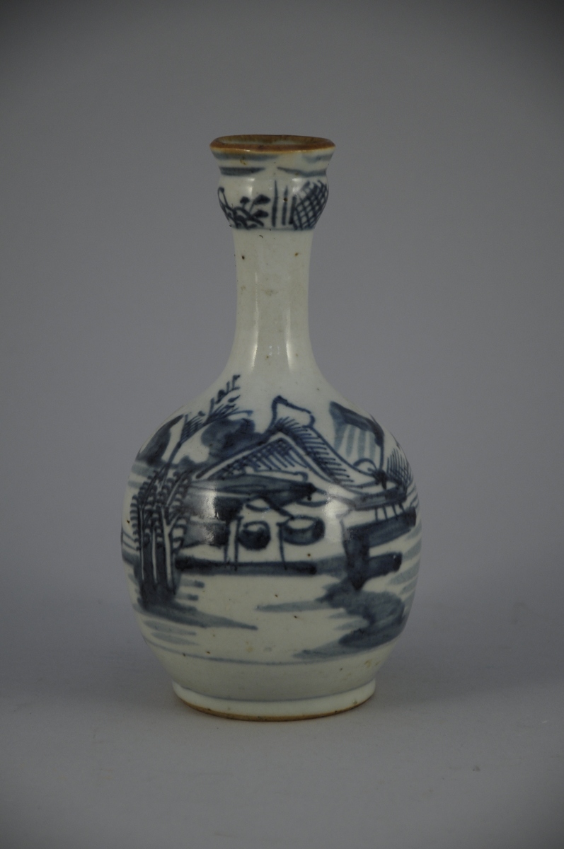 BOUTEILLE en porcelaine décorée en bleu d'un paysage.
