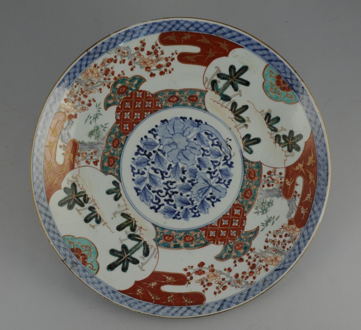 Grand PLAT ROND en porcelaine, de forme évasée et à bord lisse. Le décor: au centre d'un médaillon de fleurs en camaïeu de bleu, sur l'aile de conifères dans des réserves nuageuses fleuries et de cerisiers en fleurs dans des tons de rouge sang, vert, gris et turquoise. Le contour et l'extérieur de l'aile ornés de frises en camaïeu de bleu..
