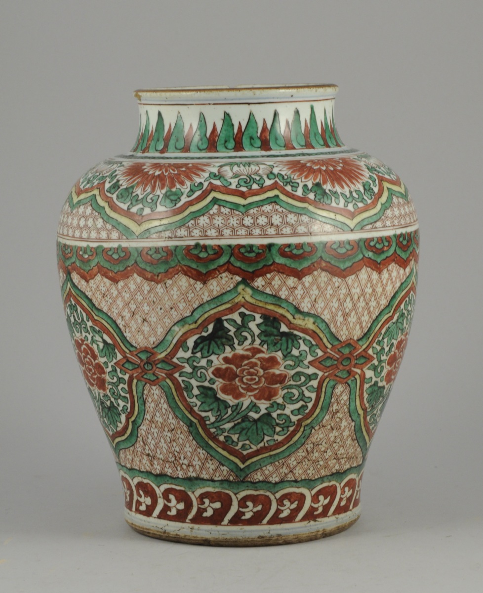 POTICHE en porcelaine émaillée polychrome dit " wucai " à décor de pivoines dans des médaillons sur fond de croisillons et frise de lingzhi sur l'épaulement. Chine, période Transition, XVIIe.
