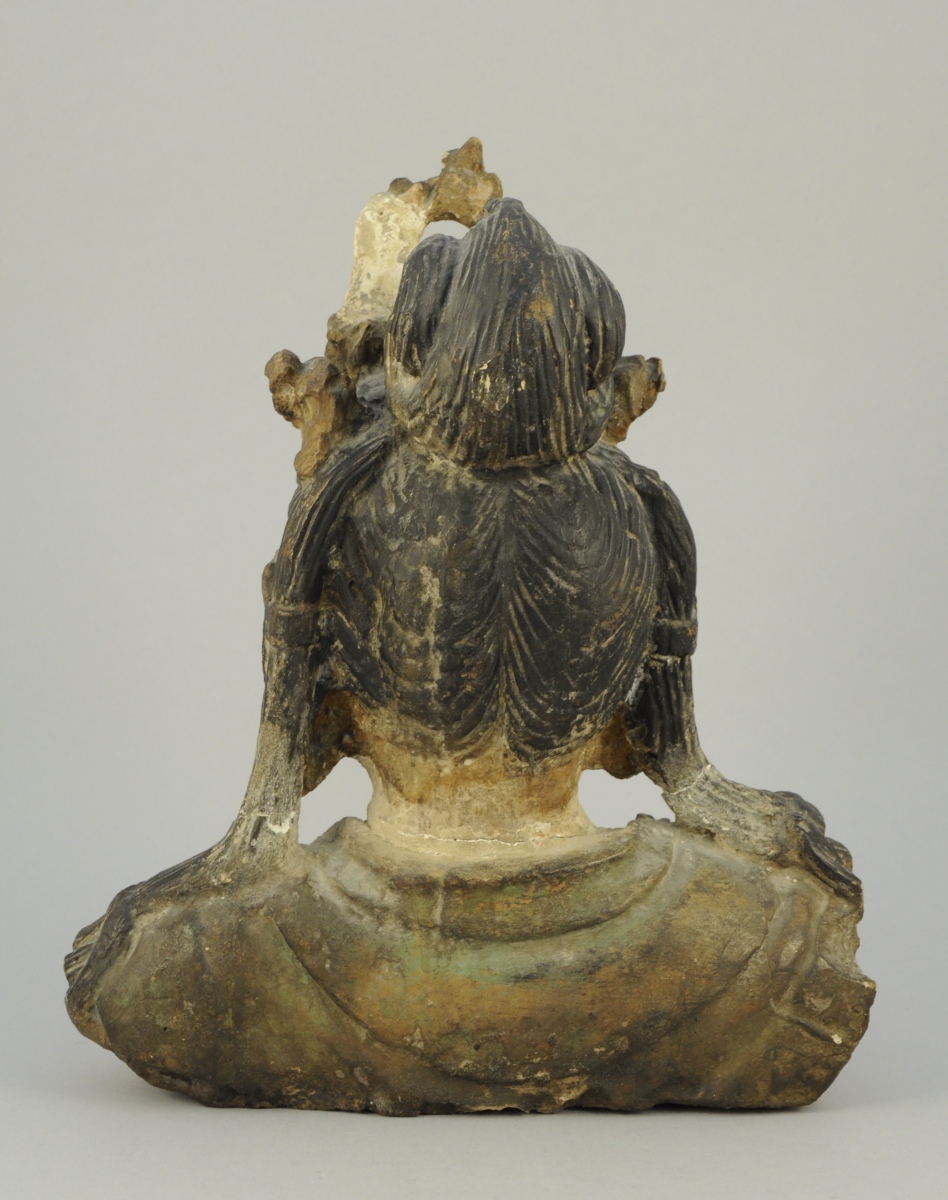 Tête de boddhisatva en platre polychromé, la coiffe ornée d'un diadème est surmontée d'un haut chignon en crosse.