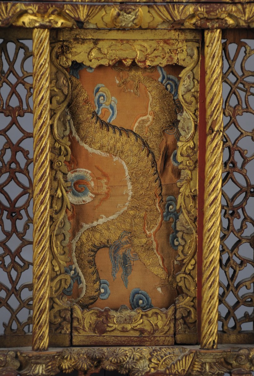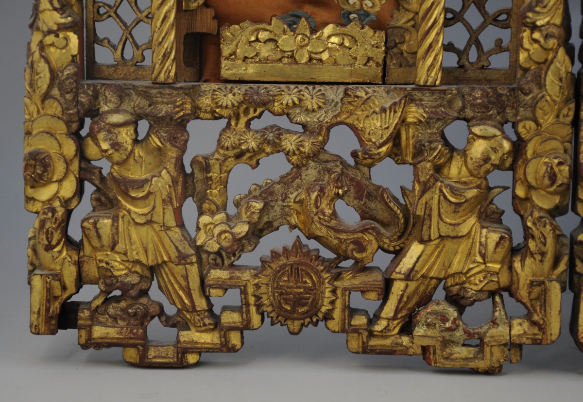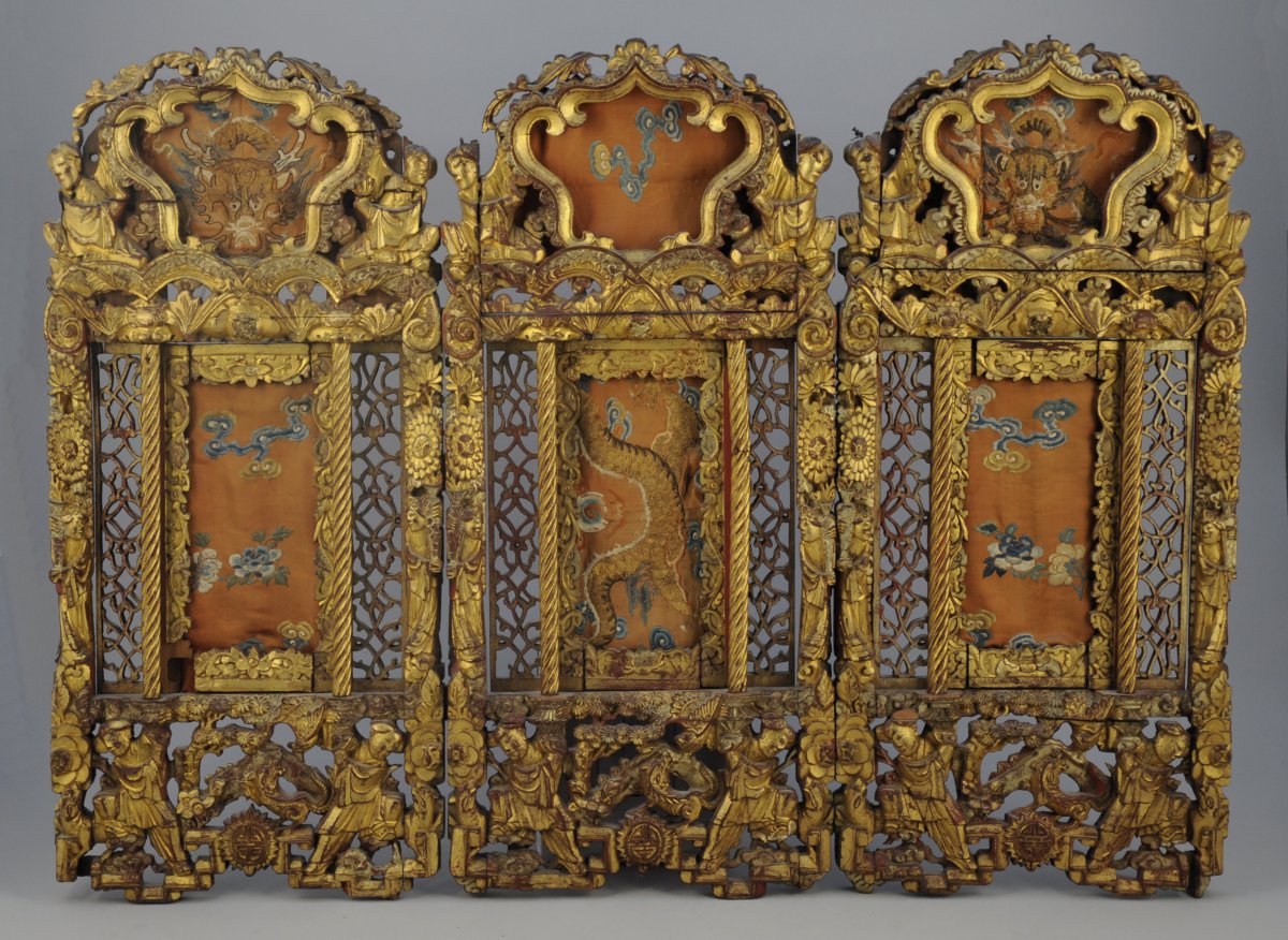 TRIPTYQUE DE NINGBO en bois sculpté et doré.Fin XIXe.64 x 89 cm (accidents, petits manques).