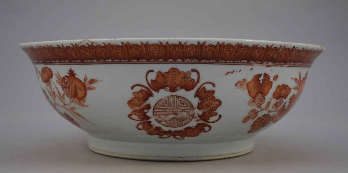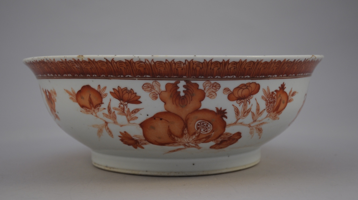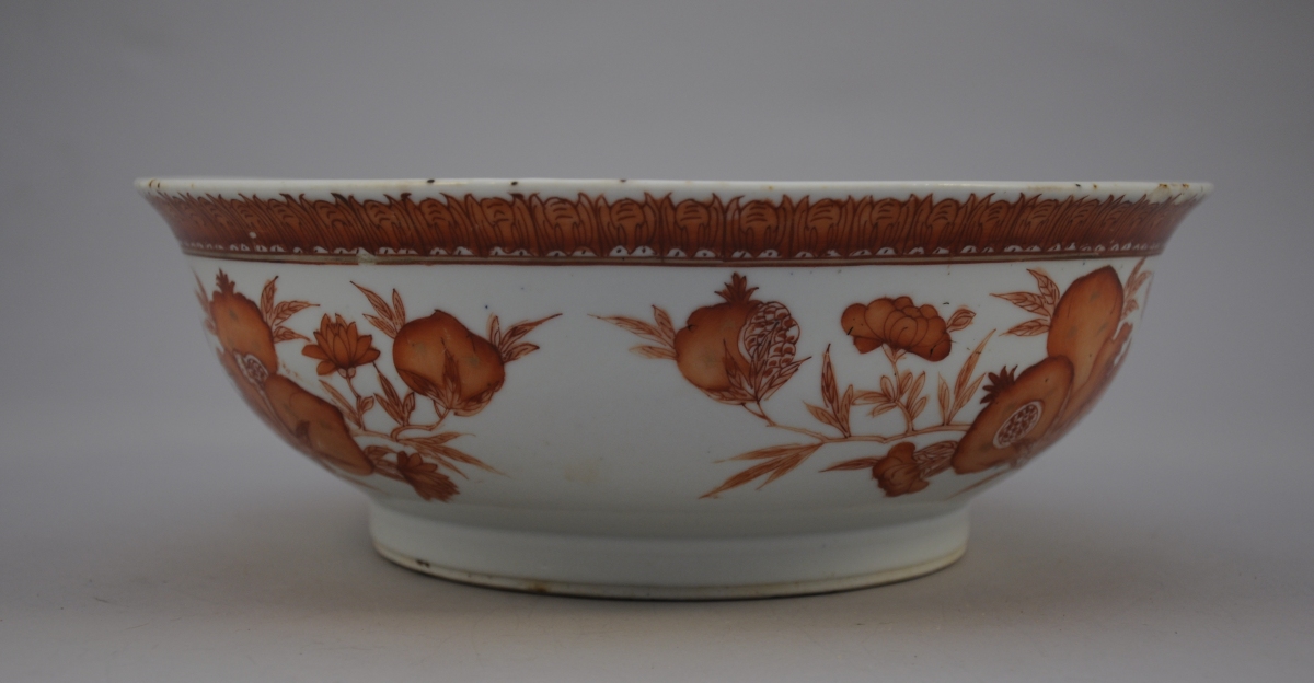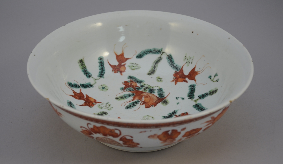 COUPE en porcelaine à décor de cypprins. Chine. XXème. Haut. 9,5 Diam. 27 cm (égrenures)