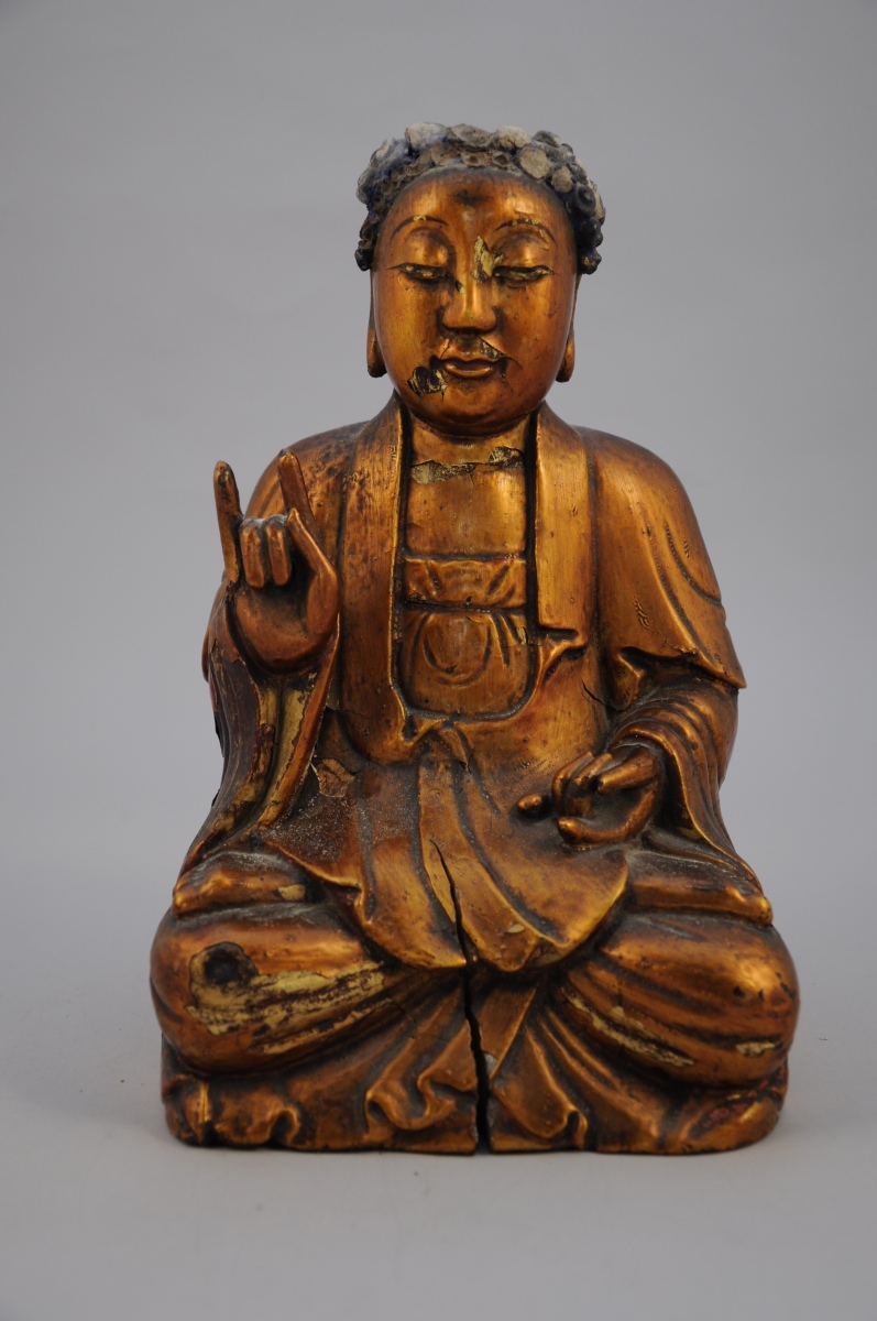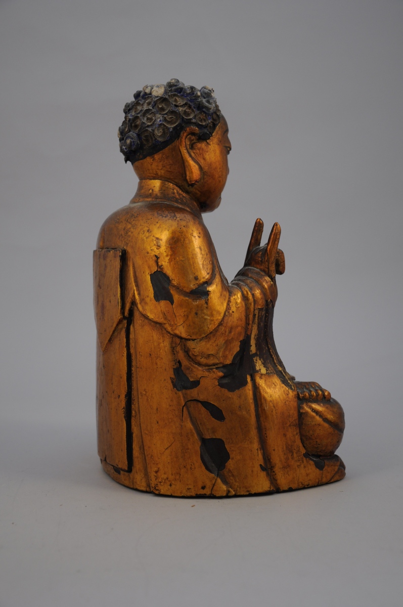 BOUDDAH reliquaire en bois sculpté, laqué et doré, coiffure polychrome bleue. CHINE. XVIII, XIXe. Haut. 26 cm. Socle tripode en bois sulpté Haut. 5,5 cm.