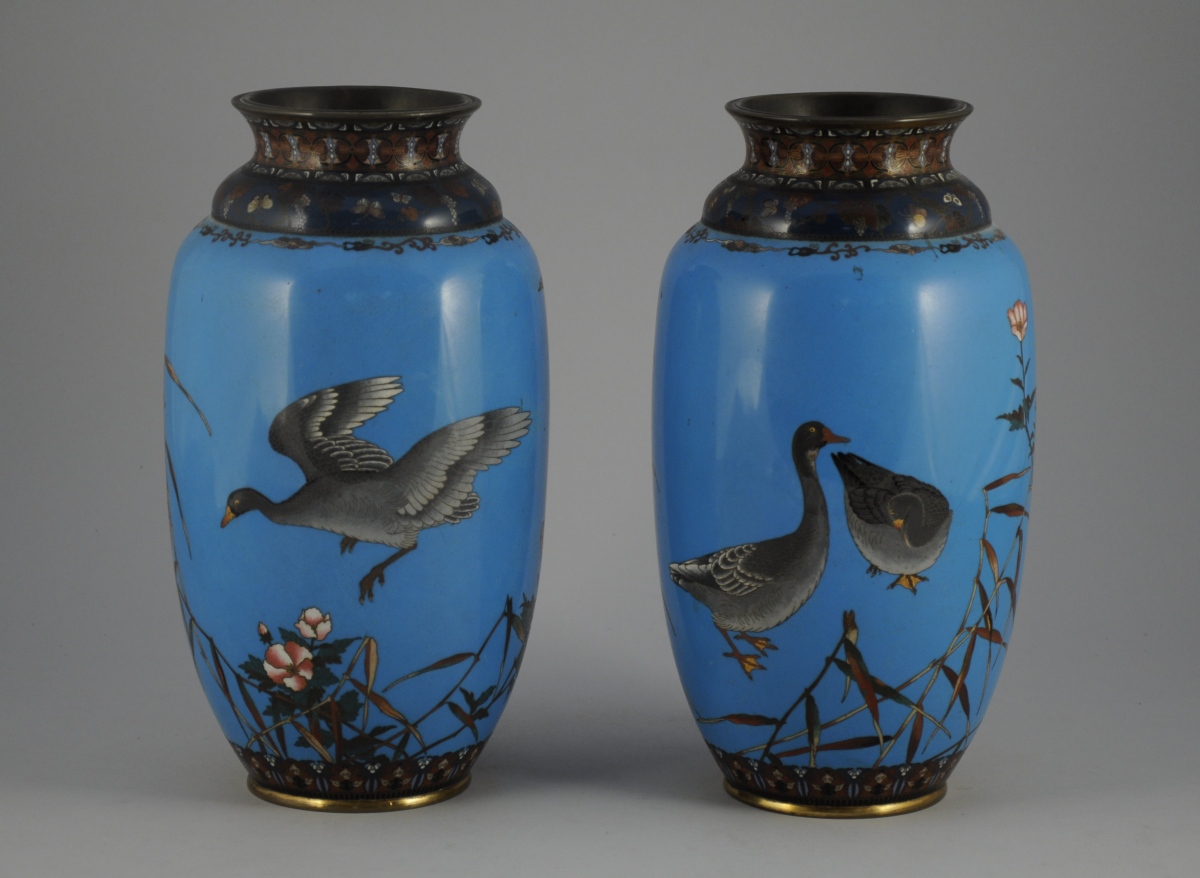 PAIRE de VASES ovoïdes en émail cloisonné à décor tournant de canards sur fond bleu.