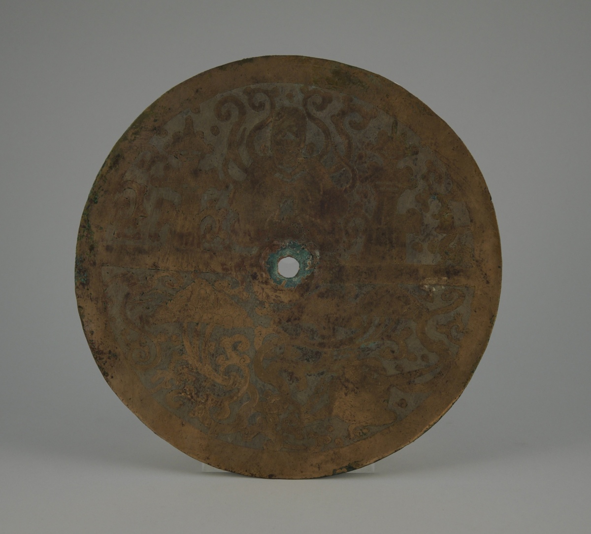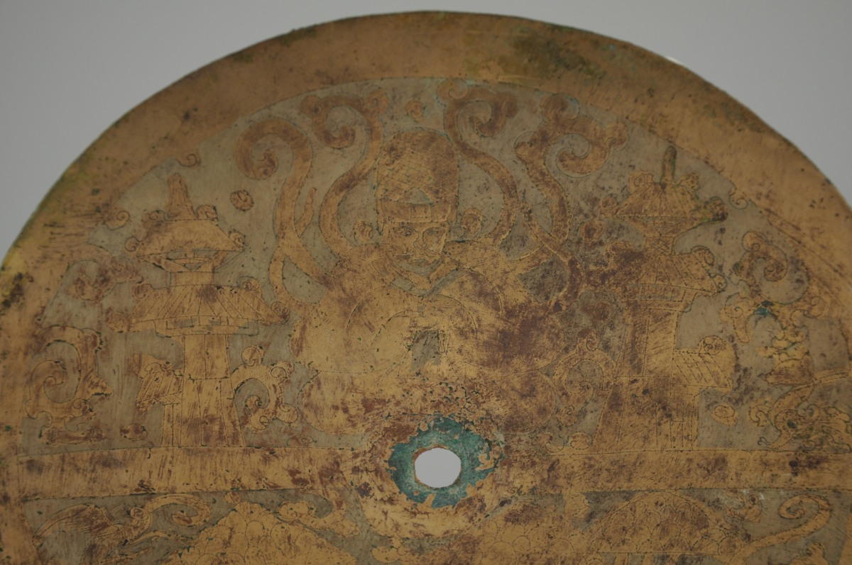 MIROIR en cuivre à décor gravé d'un dignitaire dans un entourage d'architecture et de volutes.