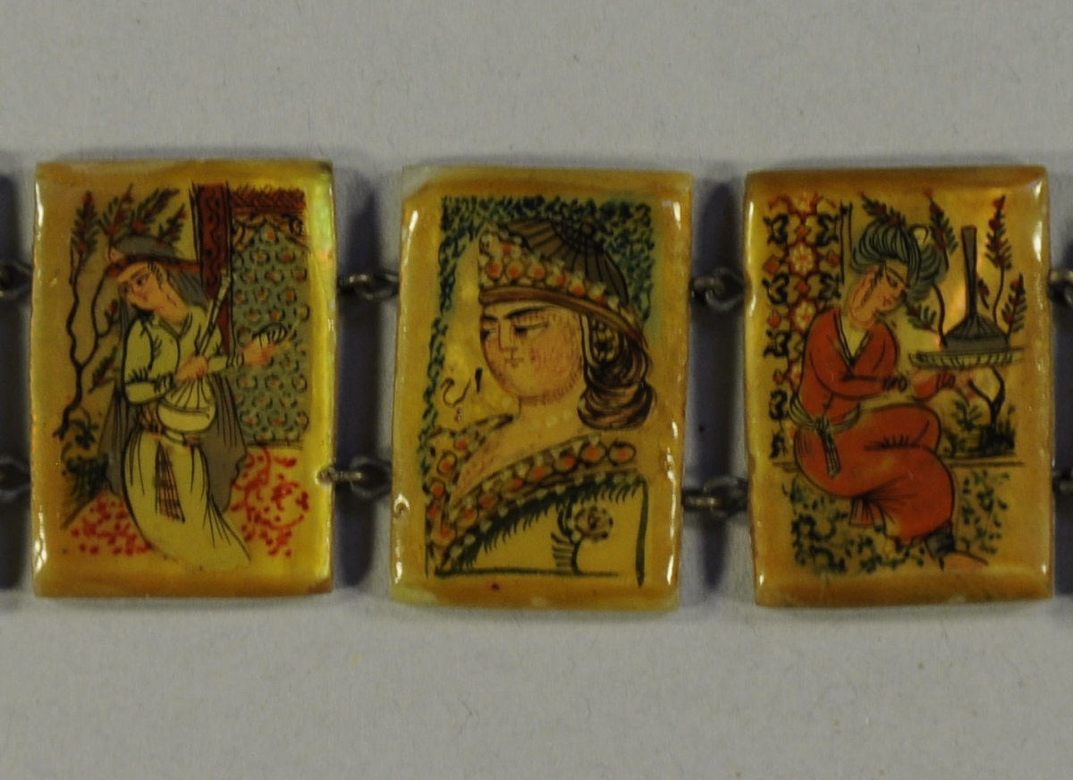 Quatre BRACELETS composés d'éléments en nacre de forme rectangulaire, médaillon ou à pans, à décor peint dans le goût des miniatures persanes.