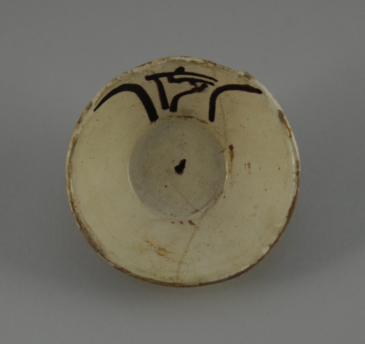 COUPELLE en céramique argileuse à décor engobé brun sur fond crème orné d'une formule al Mulk stylisée en coufique.