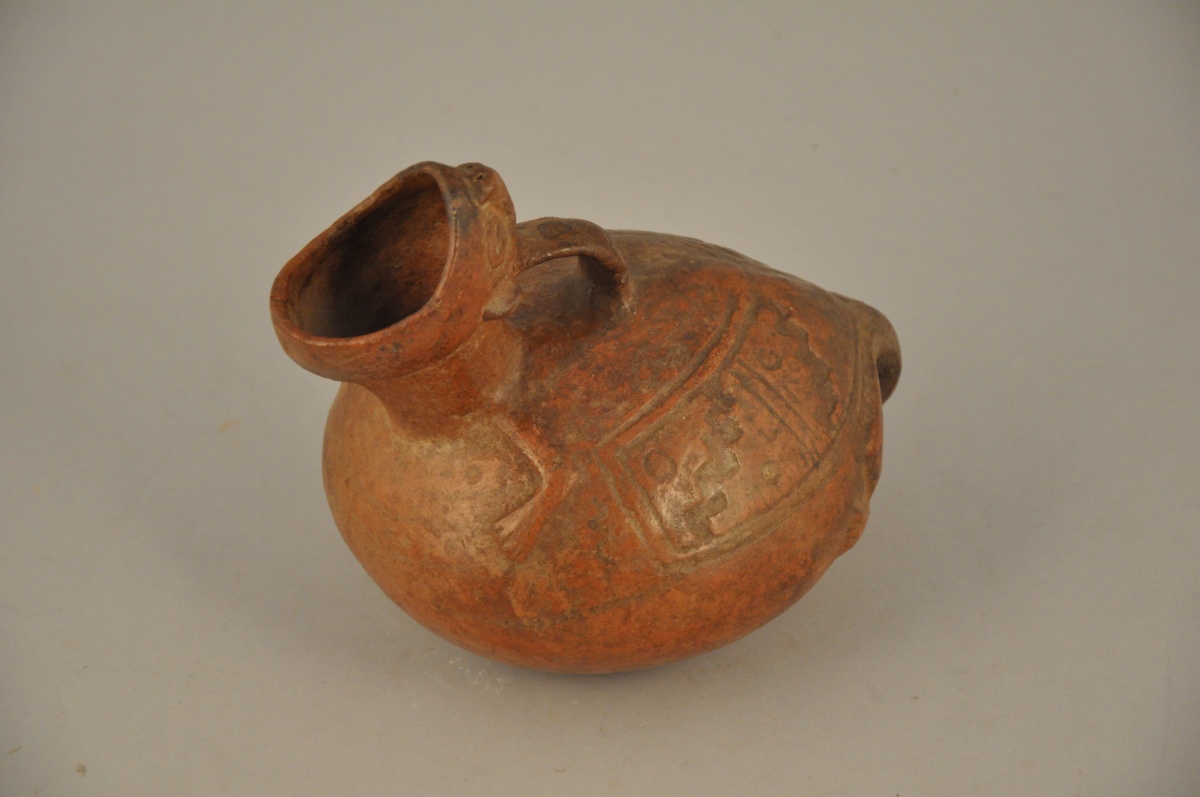 VASE à anse: animal hurlant. Terre cuite à engobe rouge, décor estampé de motifs scalaires.