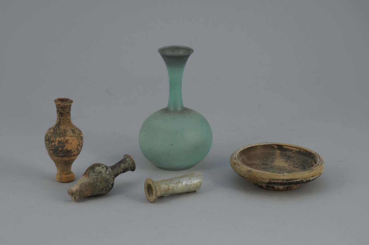 LOT comprenant une COUPE (Diam. 10,5 cm) et deux VASES en forme d'amphore (Haut. 8 et 9,5 cm, manque) en terre cuite, un col de bouteille en verre. Epoque romaine (?)