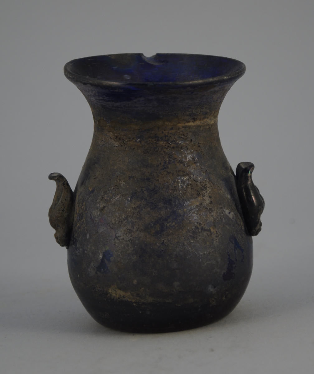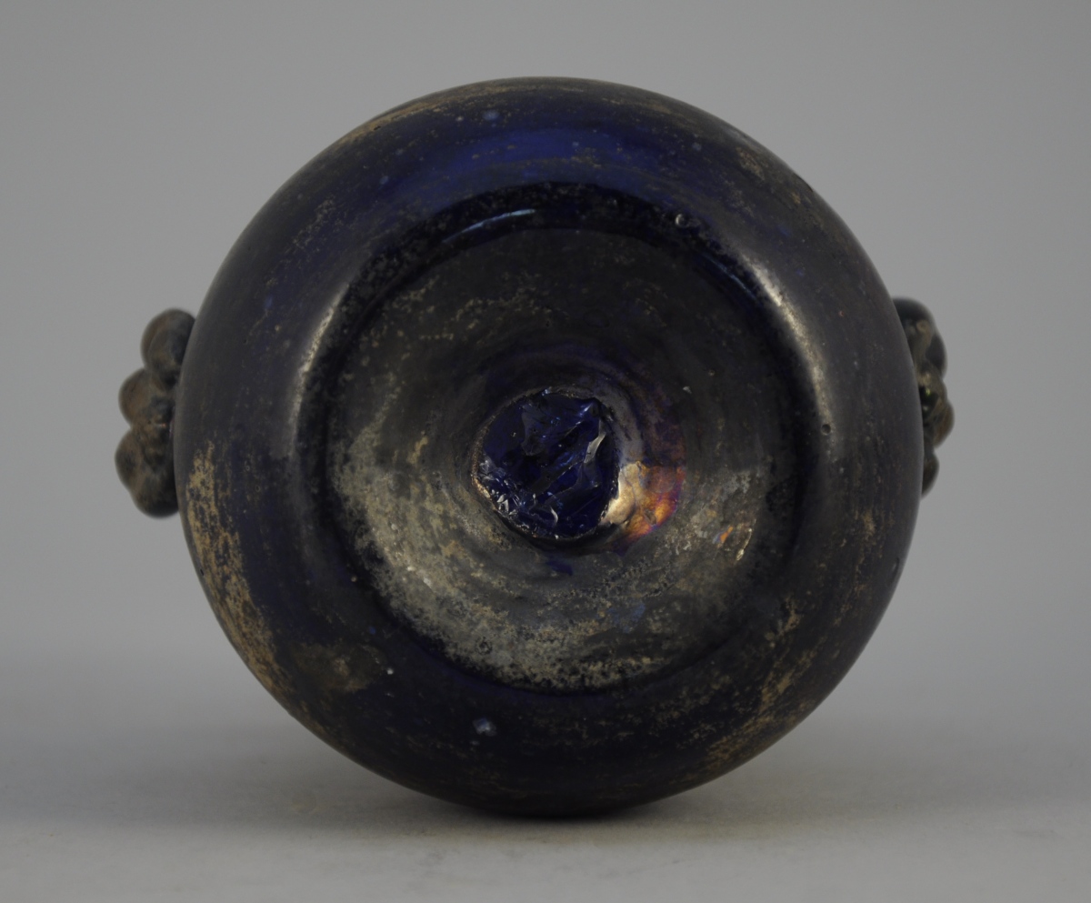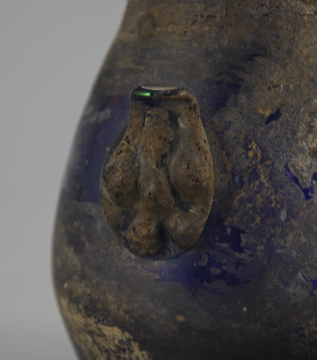 VASE piriforme à col évasé en verre soufflé de couleur bleue. Anses rapportées à chaud.