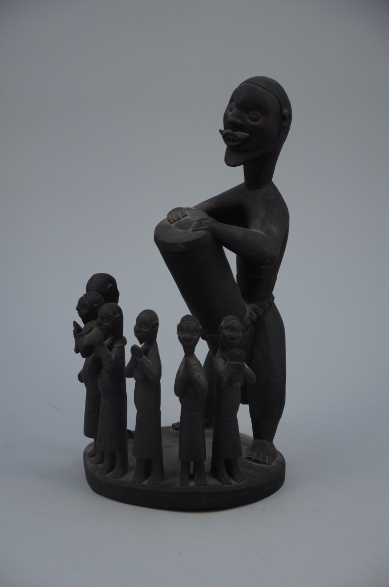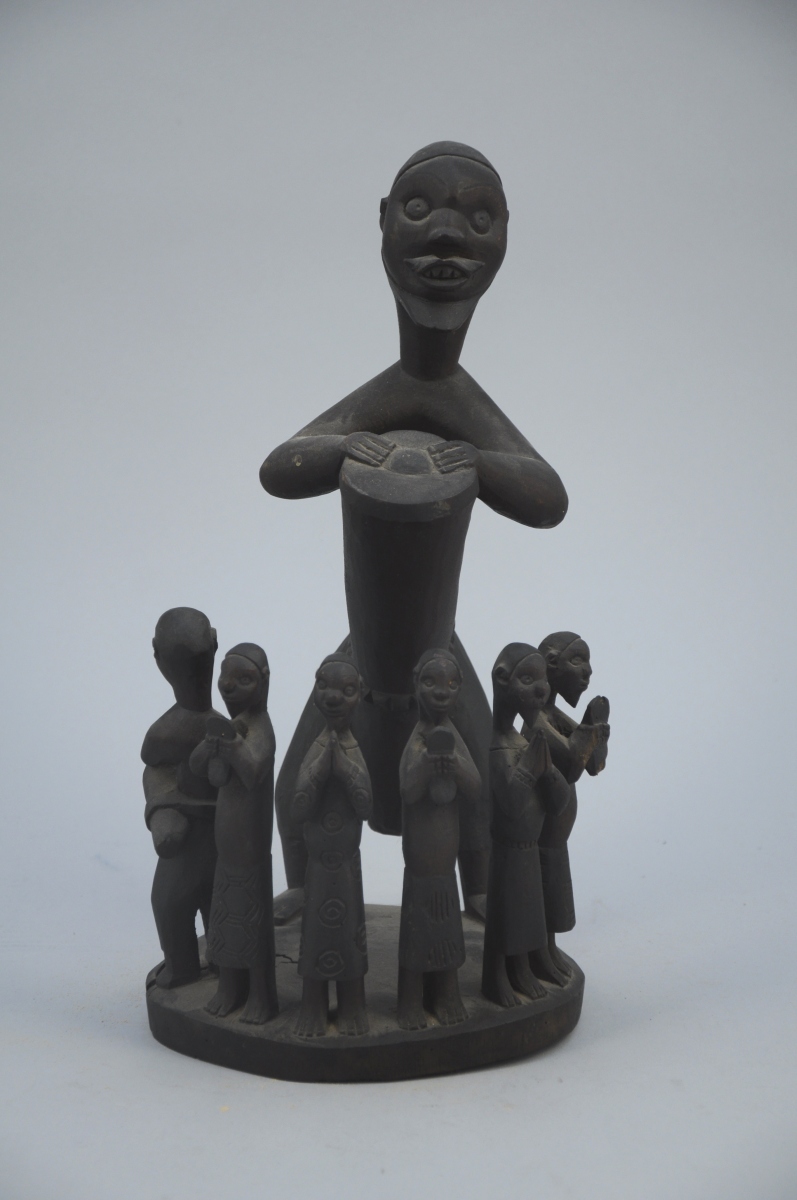 GROUPE en bois sculpté, musiciens et personnages en prière, terrasse circulaire.
