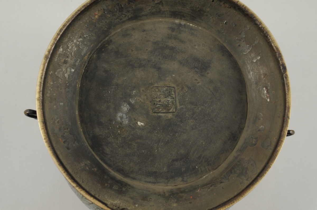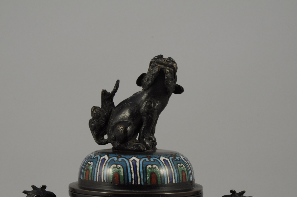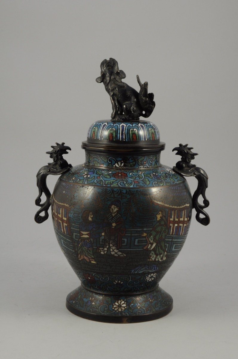 CHINE. VASE balustre couvert en métal. Décor émaillé polychrome figurant des dignitaires conversant. Deux anses en forme de chimères. Couvercle orné d'un chien de Fô.