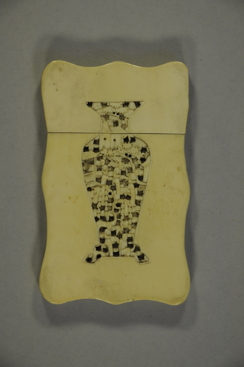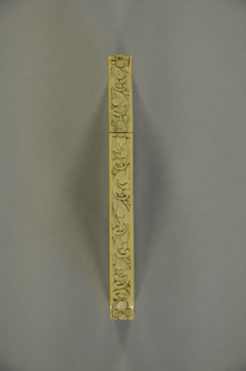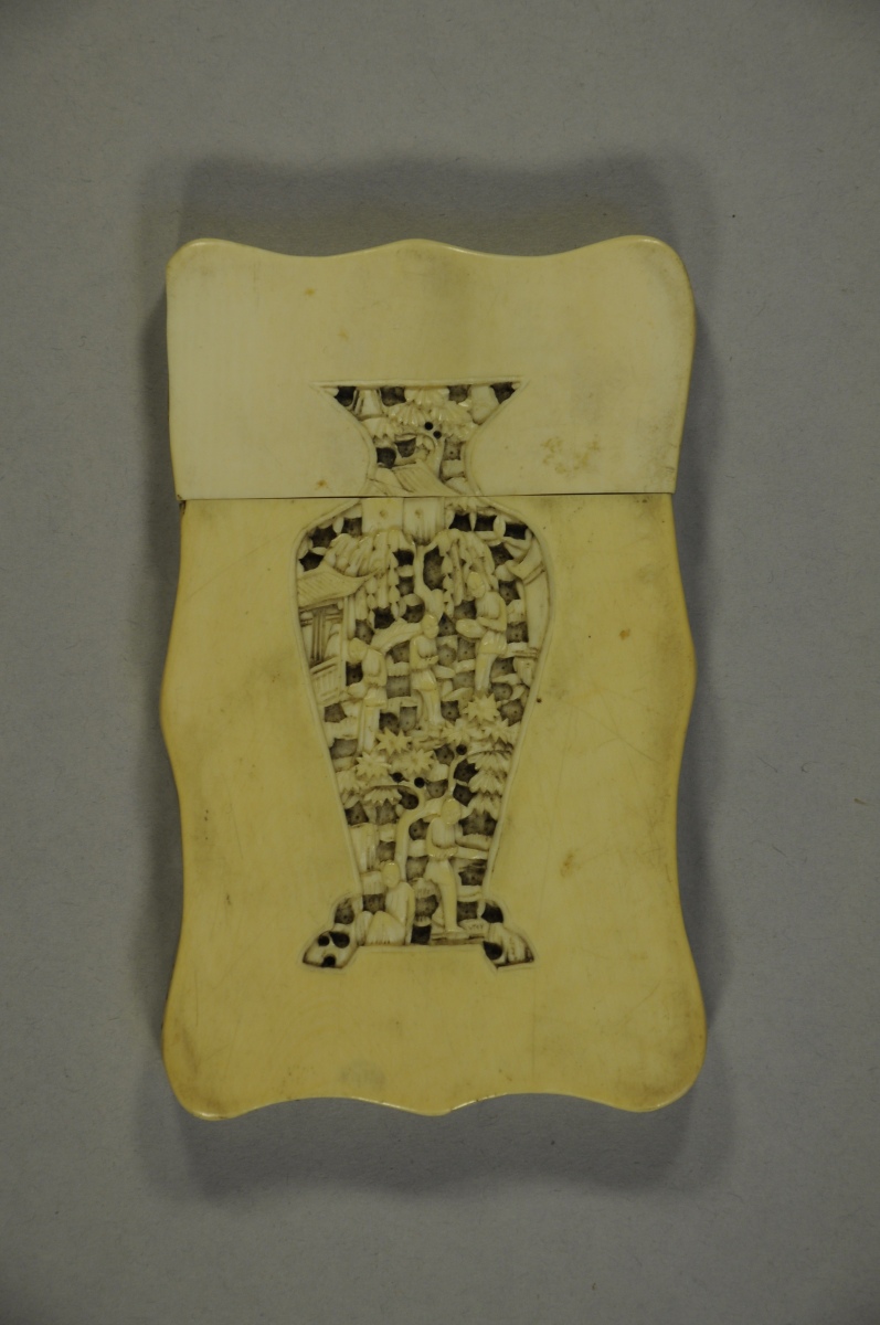ÉTUI à cartes en ivoire. De forme rectangulaire à profils chantournés, il est sculpté en creux sur chacune de ses faces de paysages animés dans des réserves en forme de vases. La bordure est ornée de rinceaux fleuris.
