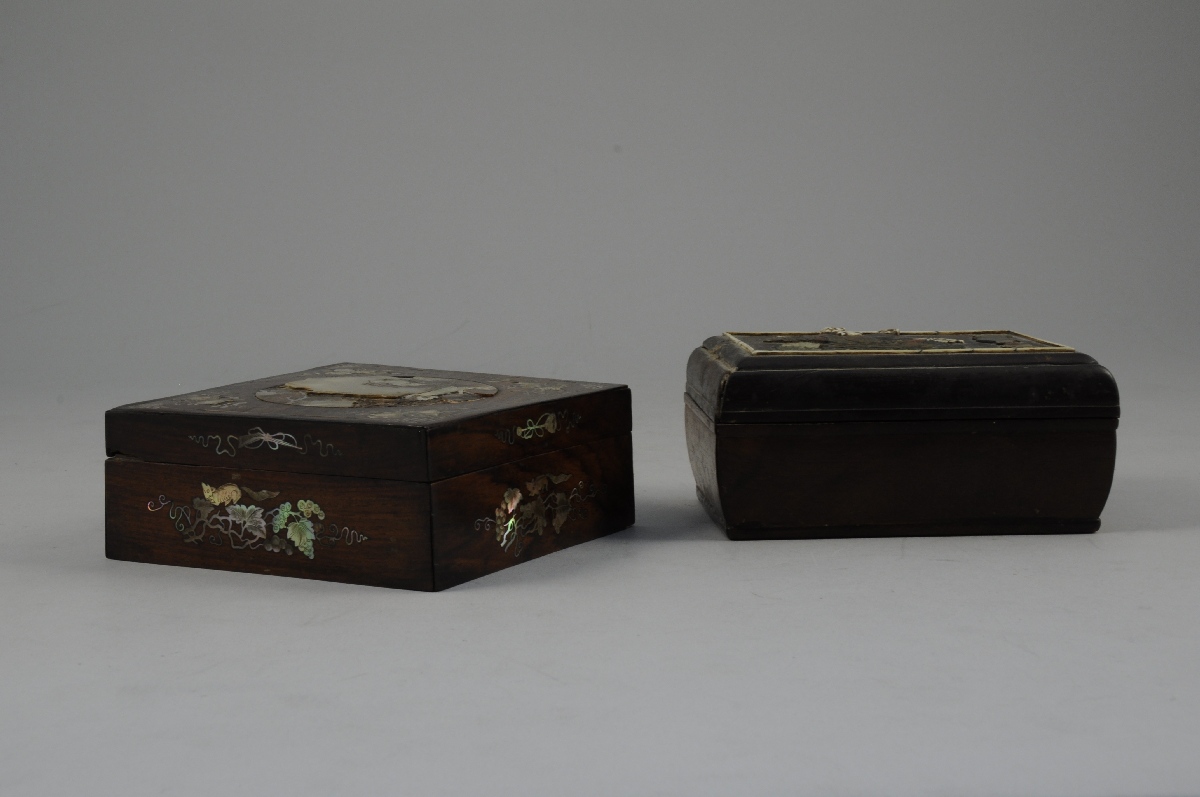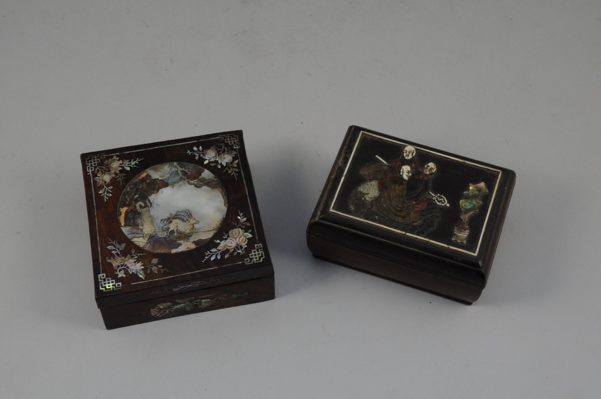 L'autre coffret, également en palissandre, avec des incrustations de nacre et d'ivoire, est orné sur le couvercle de trois sages assis sur une terrasse. Début XXème. Long. 13, Larg. 10, Haut. 6 cm.