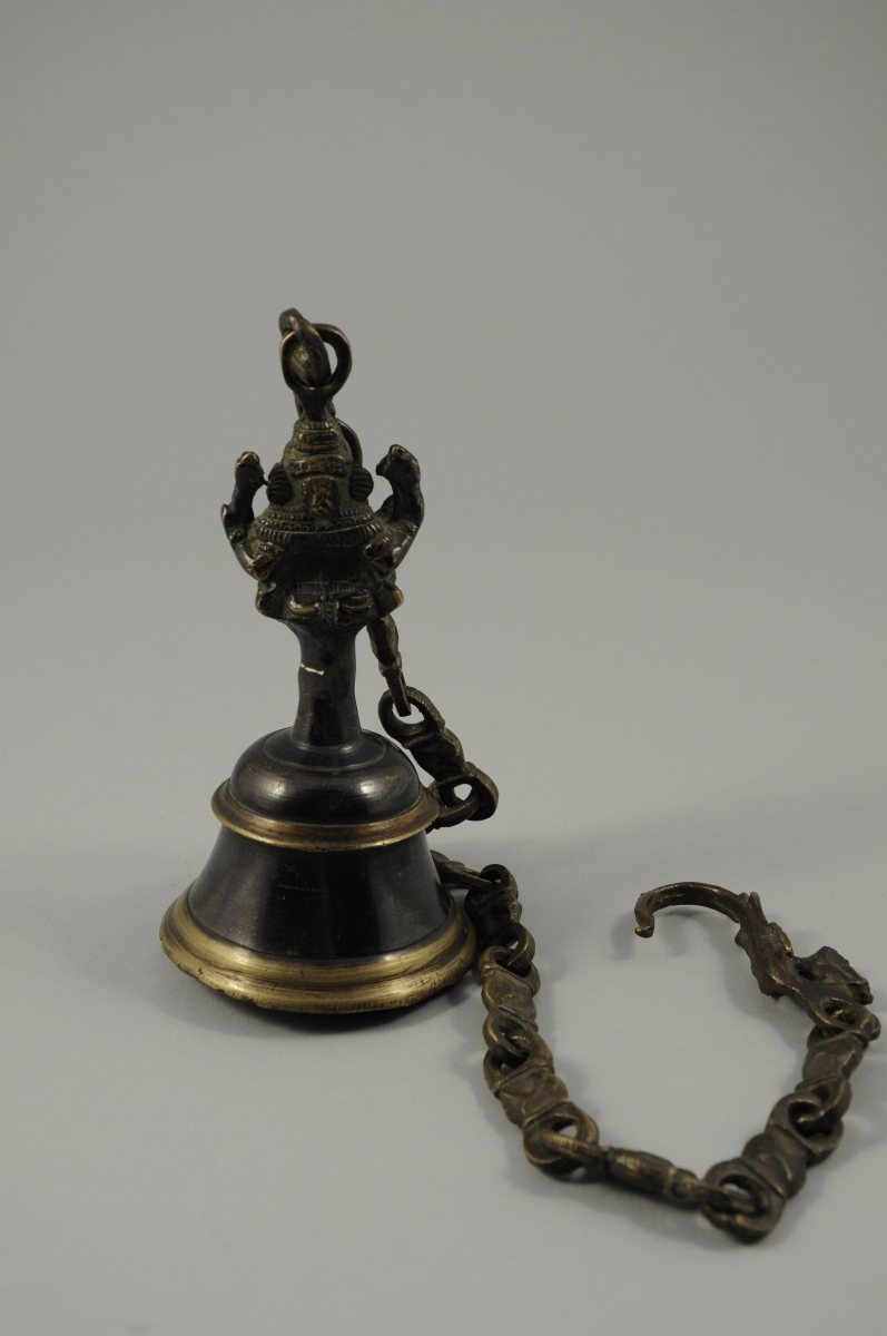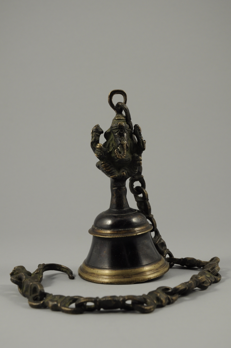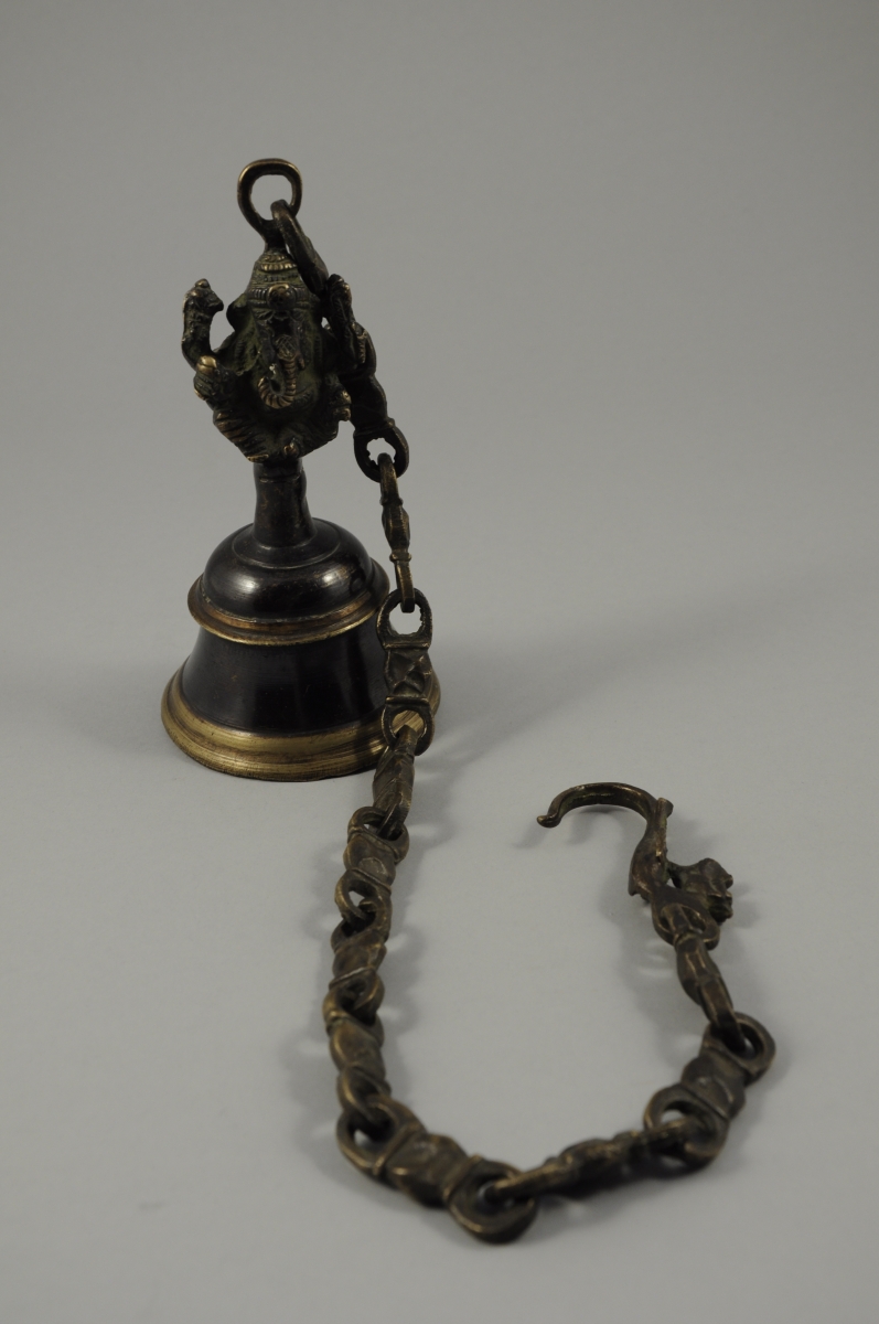CLOCHE en bronze, prise représentant Ganesh, chaîne se terminant par un sujet animalier.