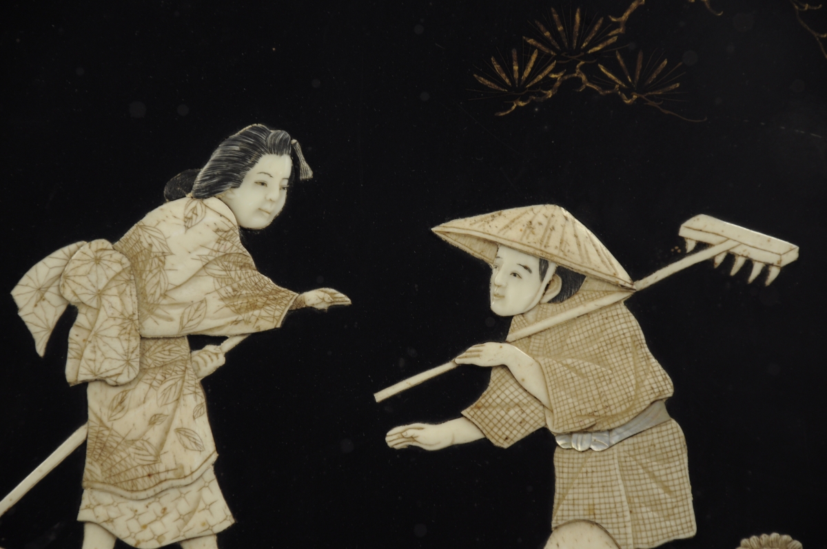 Paire de PANNEAUX en bois noirci à décor de personnages en ivoire et nacre.