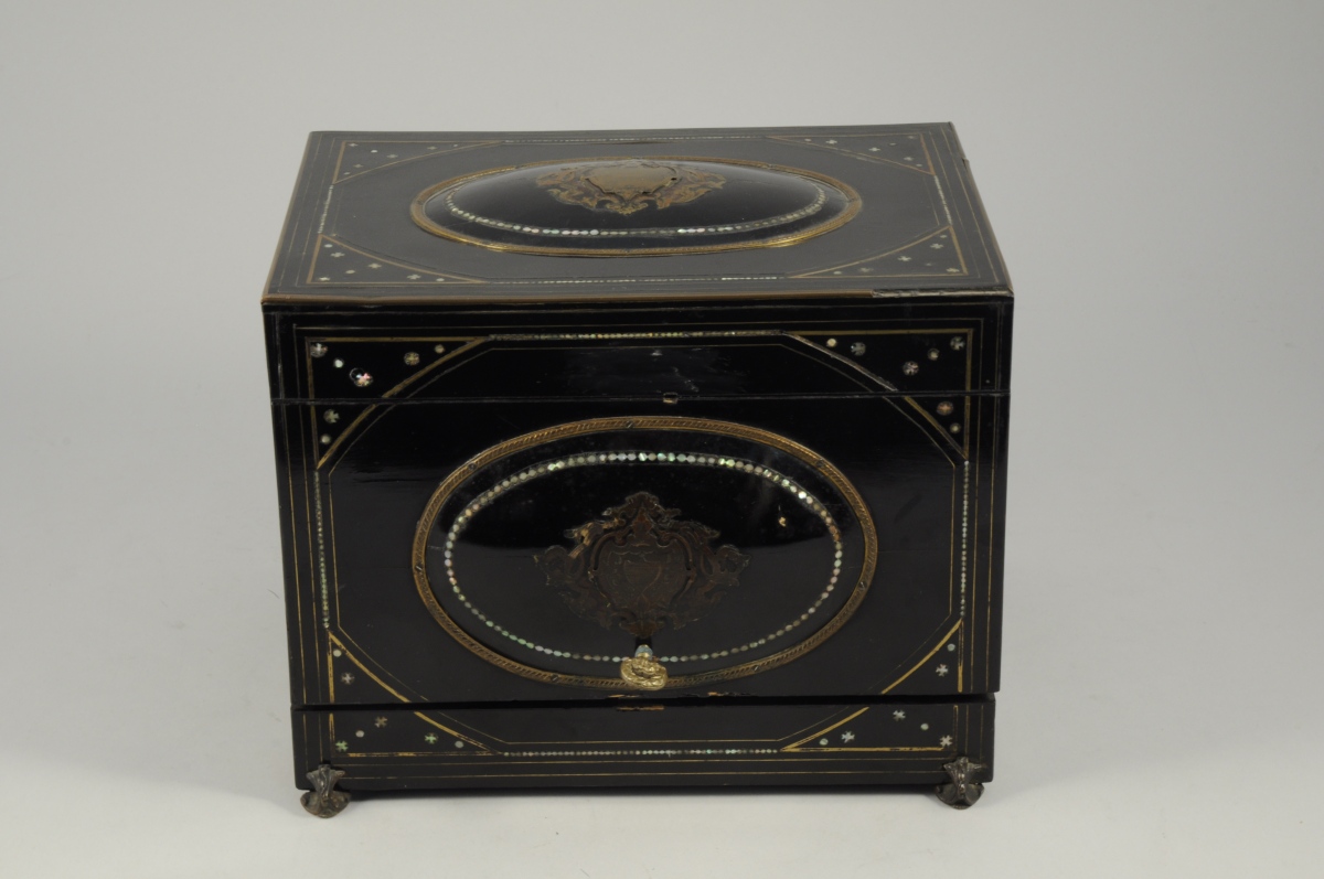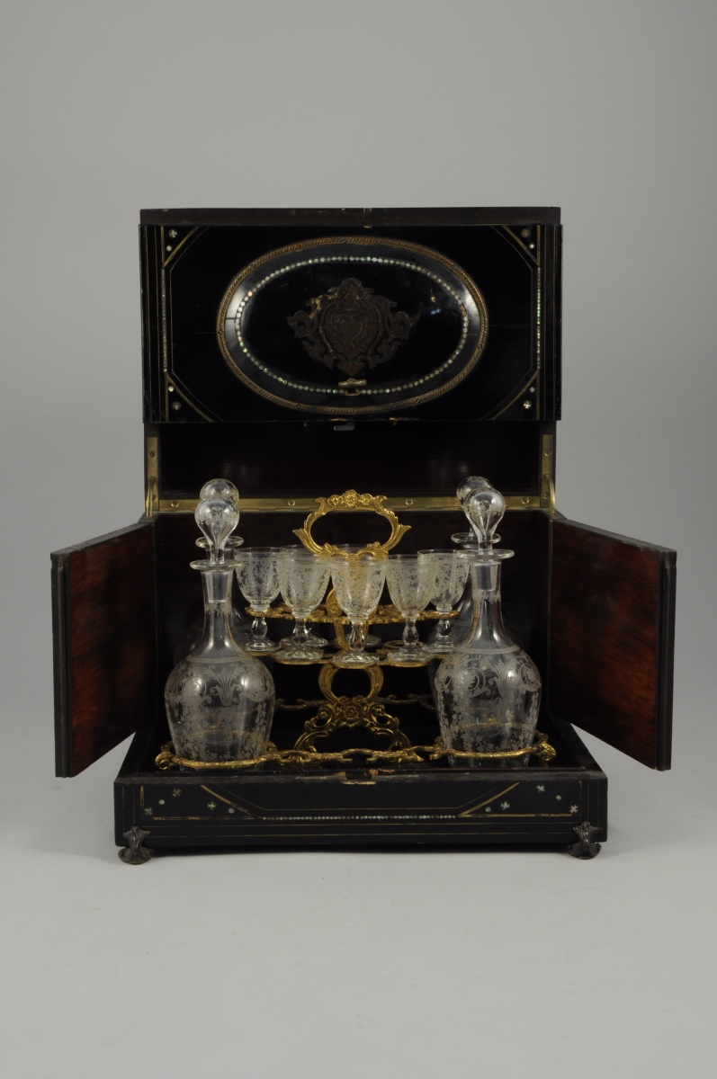 CAVE à LIQUEURS en placage de bois noirci, avec incrustations de filets de laiton et de petits ronds de nacre. Sur le couvercle et en façade, renflements ornés d'écussons en laiton doré. Intérieur plaqué de palissandre, comprenant sur un support de bronze doré, quatre carafes et sept verres à pieds à décor gravé de guirlandes végétales.