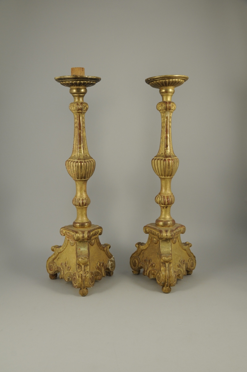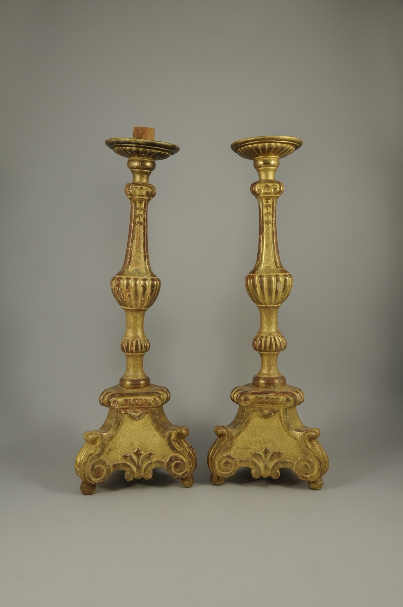 Paire de PIQUE-CIERGES en bois sculpté et doré. La base de plan triangulaire reposant sur trois pieds boule, ornée de feuilles stylisées et de volutes. Le fût à motifs de godrons. XVIIIème. Haut. 65 cm.