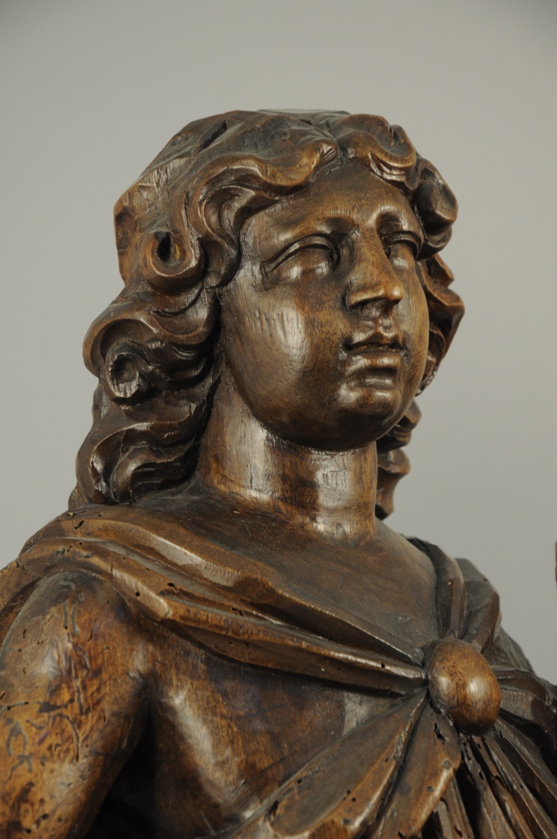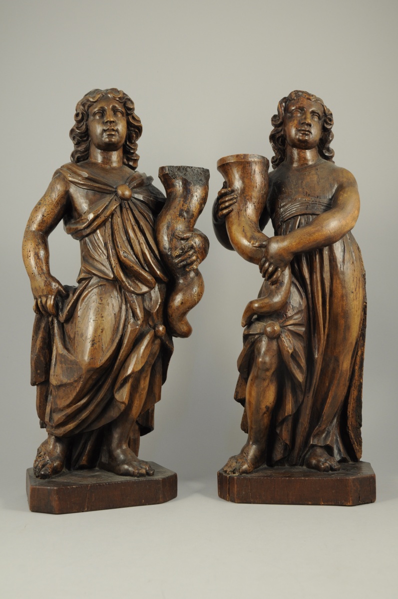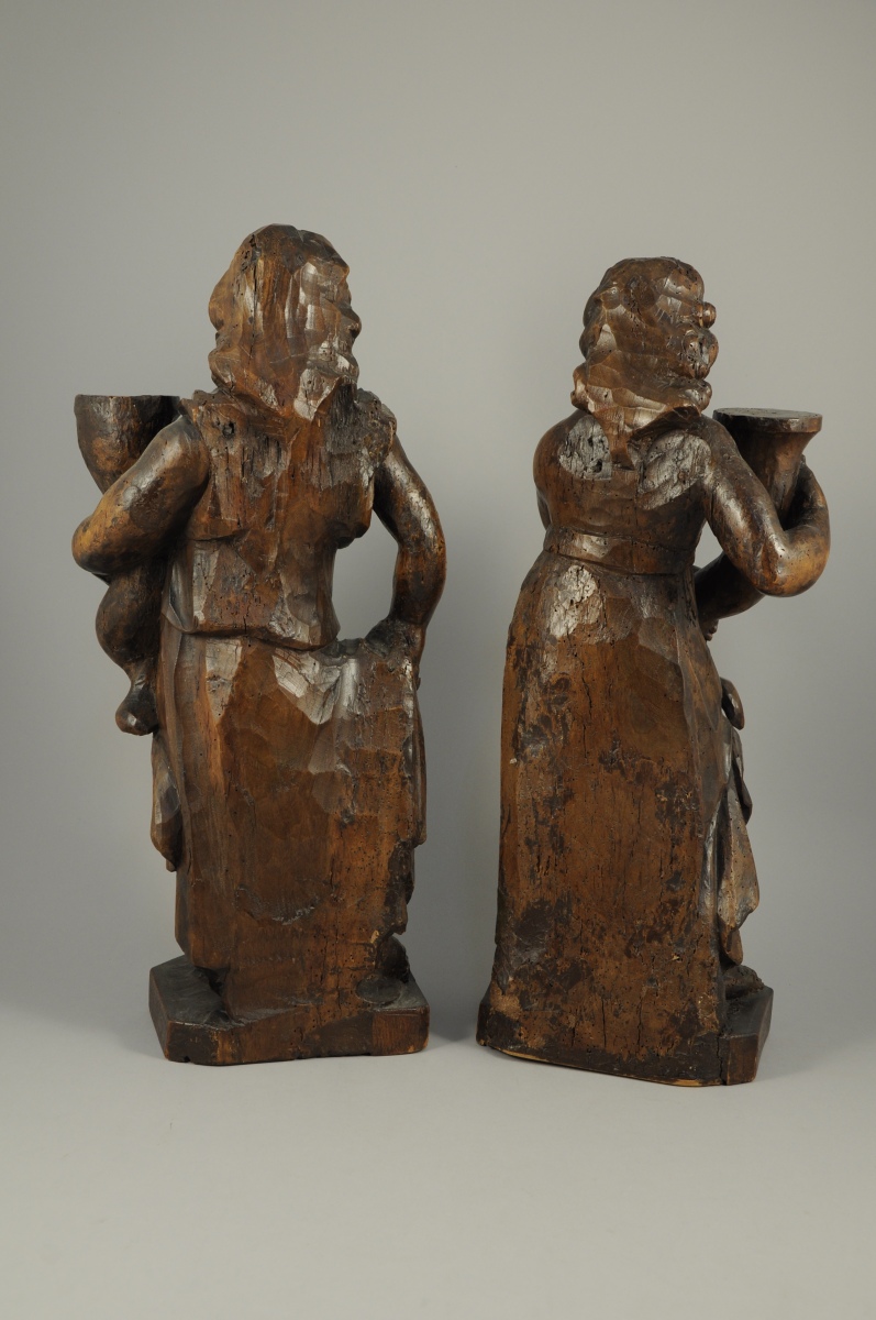 Deux SUJETS en bois sculpté formant pendants, représentant des personnages portant des cornes d'abondance. XVIIIème. Haut. 60, Larg. 23, Prof. 16,5 cm. (travaux de vers)