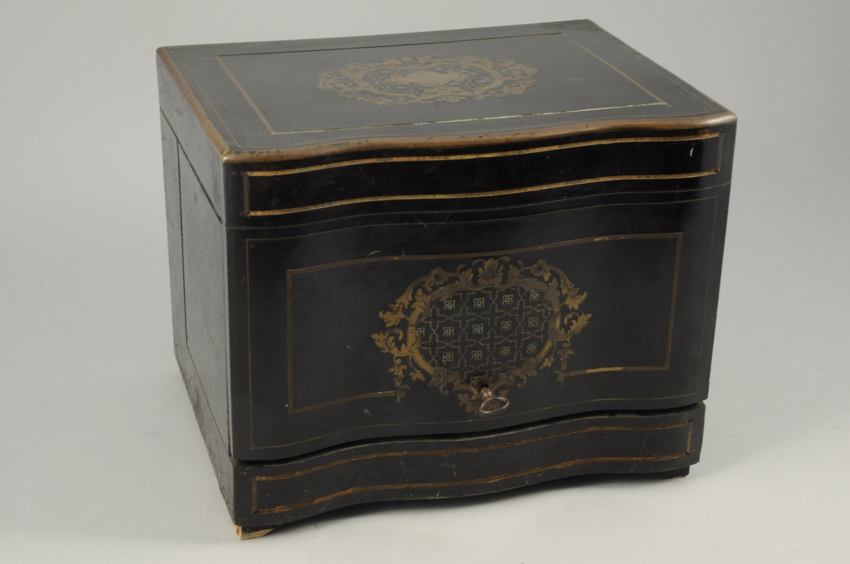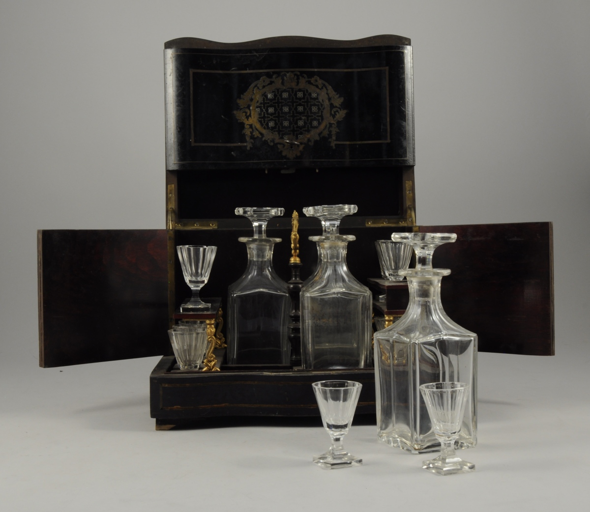 CAVE à LIQUEURS en bois noirci et incrustations de laiton. Le couvercle et la façade sont ornés de croisillons dans des réserves florales de style rocaille. Elle comprend quatre carafes et treize verres en cristal.