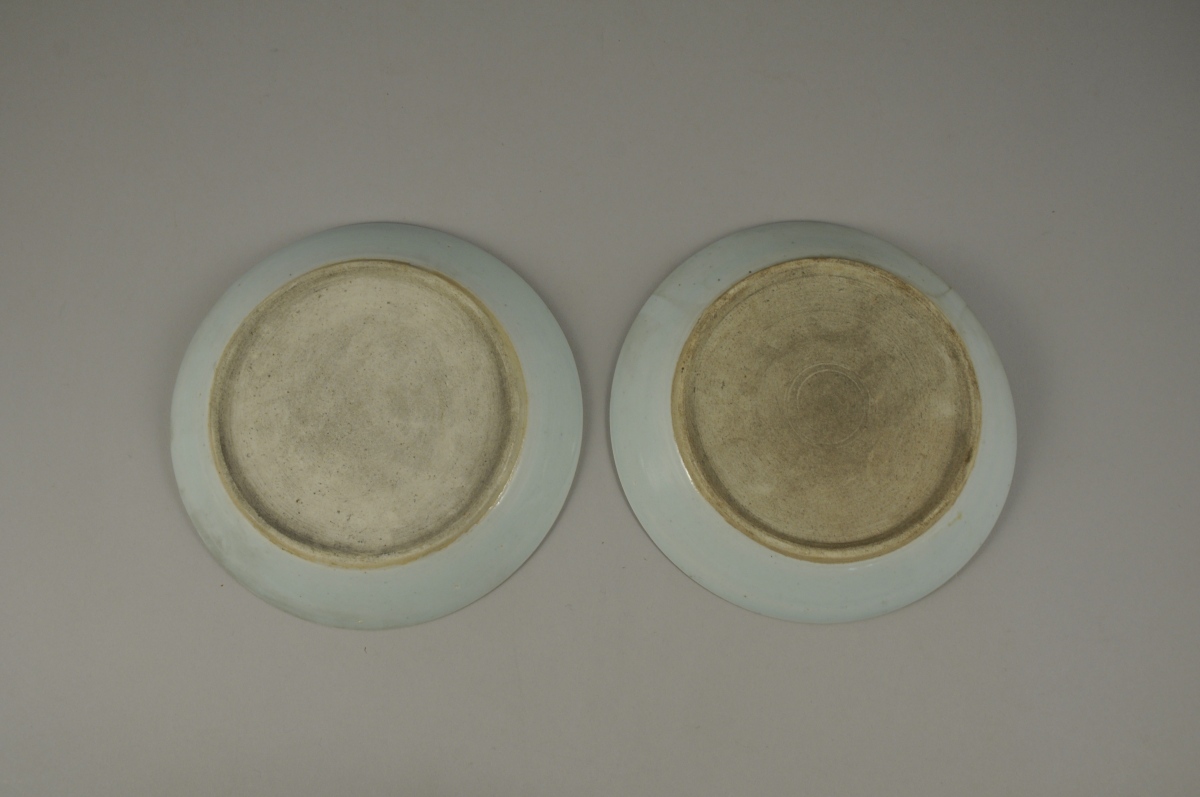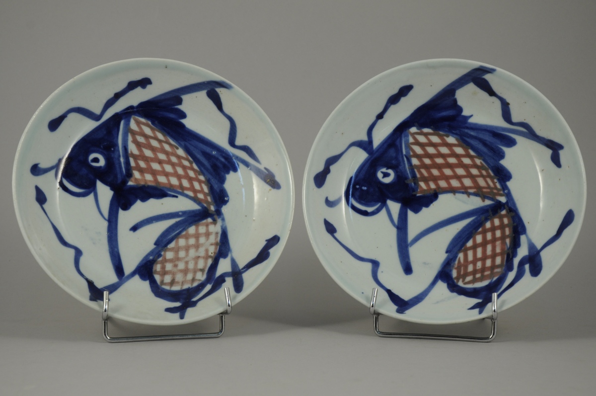 PAIRE D'ASSIETTES à décor de carpes, symbole de prospérité, en bleu cobalt et rouge de cuivre sous couverte.