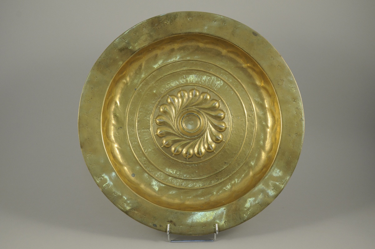 PLAT À OFFRANDE en laiton décoré au repoussé. Au centre, frise de godrons tournant autour d'un ombilic, inscription en lettres gothiques et feuillages stylisés. Sur l'aile, petits motifs estampés.