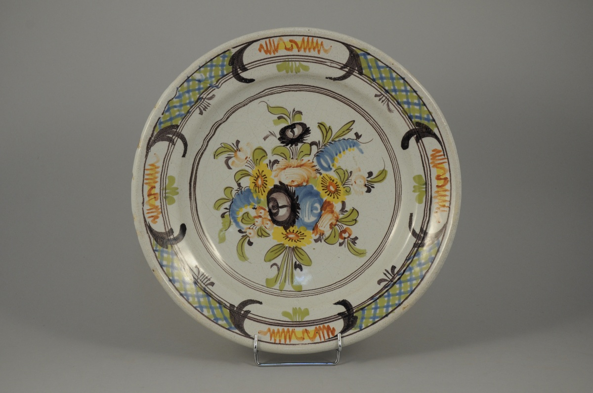 Grand PLAT ROND en faïence à décor en polychromie de grand feu de fleurs dans le bassin et de réserves et quadrillages sur l'aile.