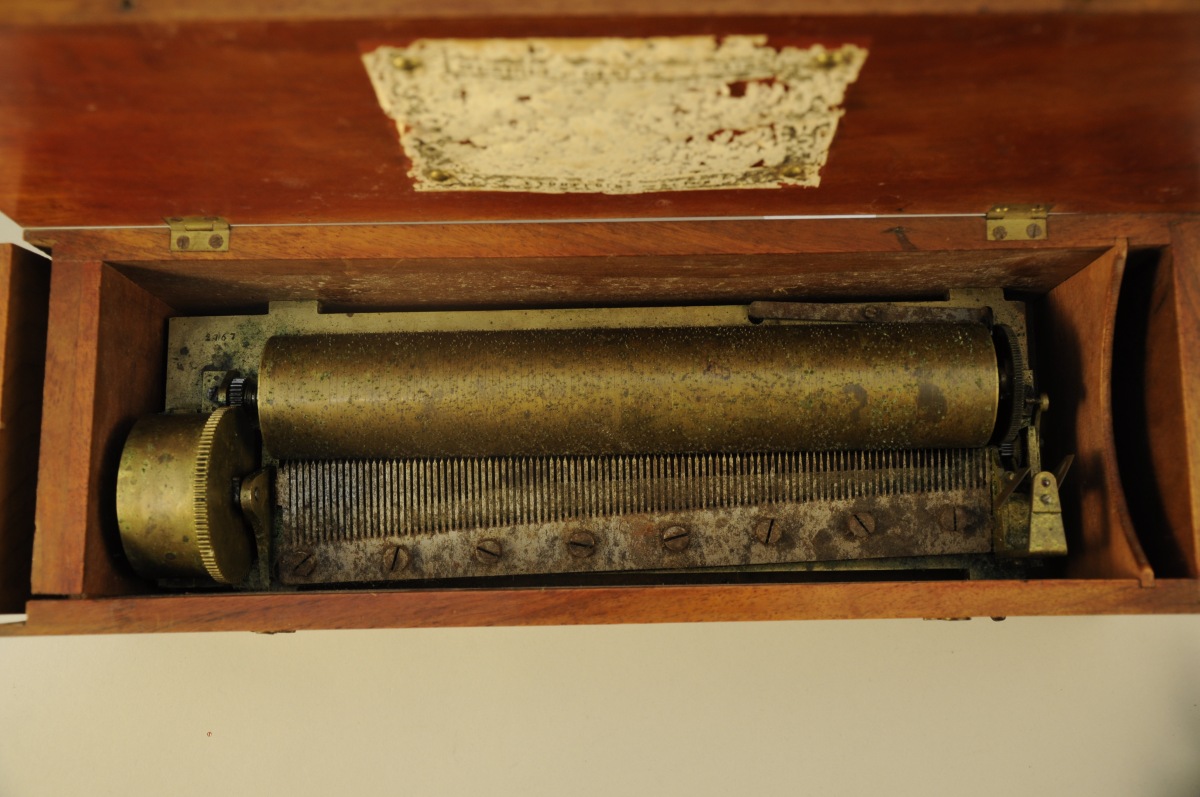 SUISSE. BOITE À MUSIQUE à cylindre, rectangulaire en acajou. Remontage à clef. 3 commandes. Porte le n° 2767. Cylindre 26,5 cm. Mention sur l'étiquette: "Musique de Genève. Airs. Etouffoirs en acier".