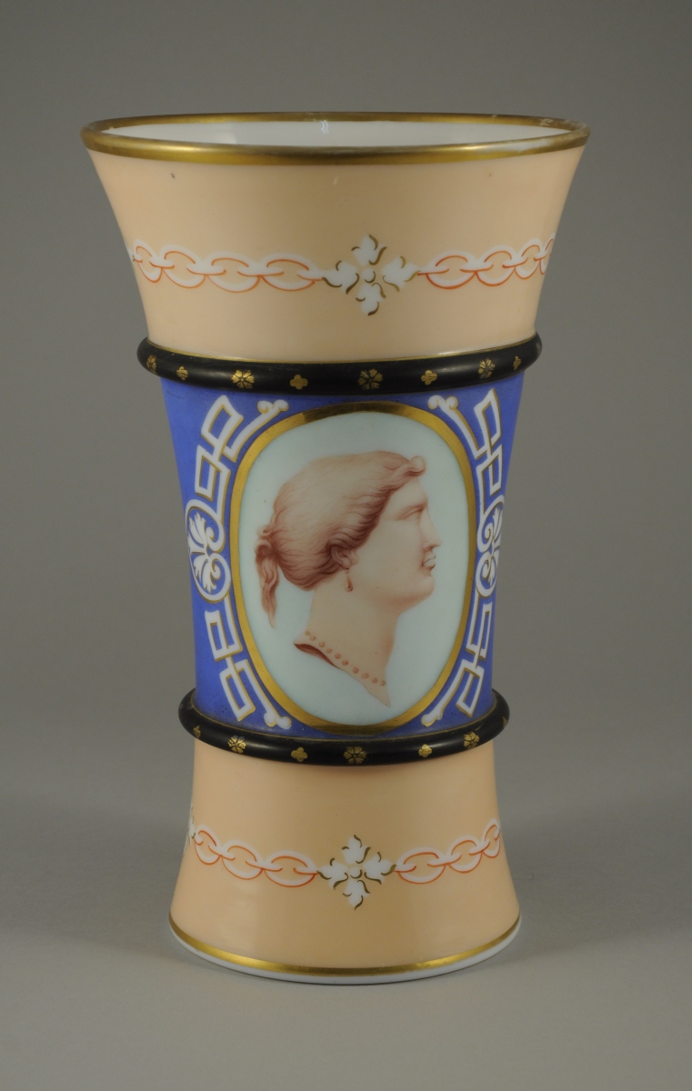 VASE de forme évasée en opaline blanche à décor peint et doré d'un profil de femme à l'imitation du camée.