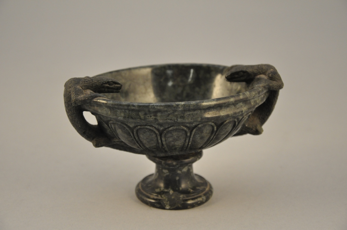 COUPE en marbre jaspé vert, à décor godronné. Ornée de part et d'autre de lézards. Haut. 7,5, Larg. 13 cm (éclat au socle).